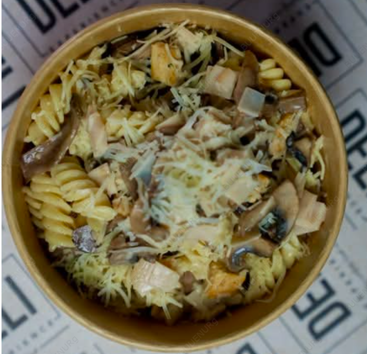 Bowl pasta Alfredo fusilli con jamón de pavo, champiñones, pollo a la plancha y queso parmesano.