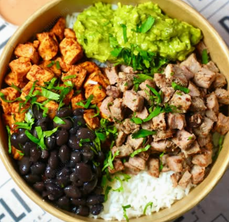 Bowl con pollo al chipotle y arrachera con pimienta, arroz basmati, frijoles, guacamole contiene limón, cilantro, pico de gallo y aderezo mayonesa chipotle.