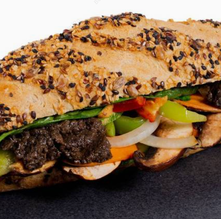 Espinaca baby, zanahoria salteada, hongo portobello asado, pimientos morrones, cebolla, queso panela y tapenade de aceituna negra, el baguette contiene semillas.