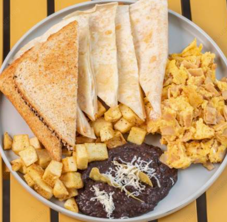 Sincronizada, huevo con jamón, frijoles, papas deli experience pimienta y limón y pan de caja.