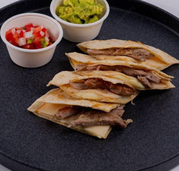 Arrachera marinada, pimienta, guacamole, lechuga, pico de gallo salsa mexicana, jitomate y cebolla y quesillo.