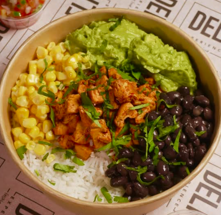 Bowl con pollo al chipotle, arroz basmati, frijoles, elotitos, guacamole contiene limón, cilantro, pico de gallo y aderezo mayonesa chipotle.