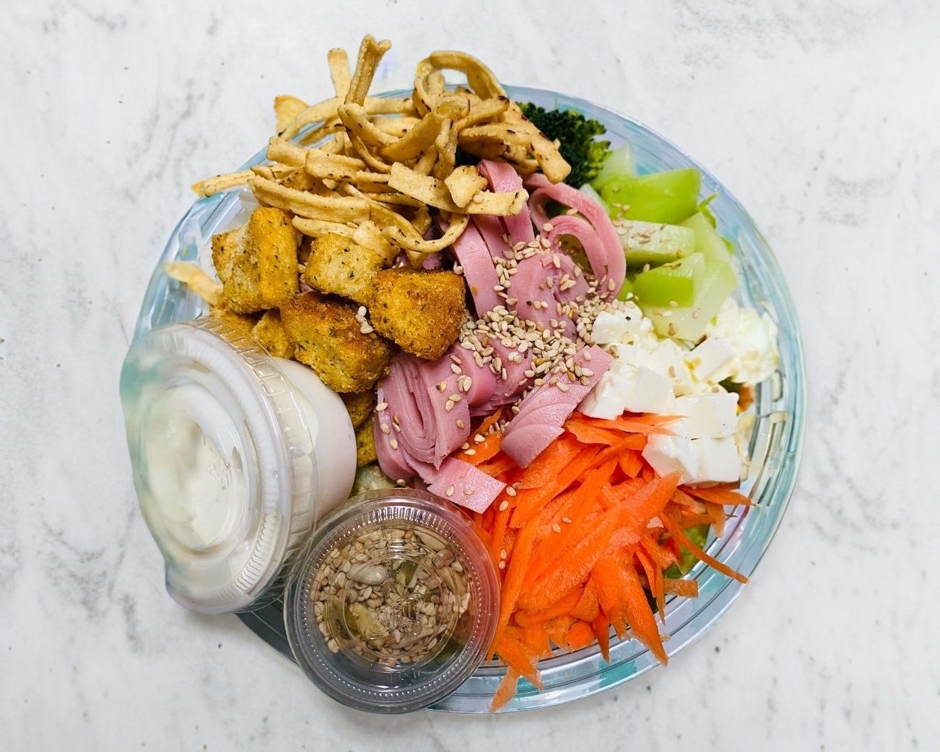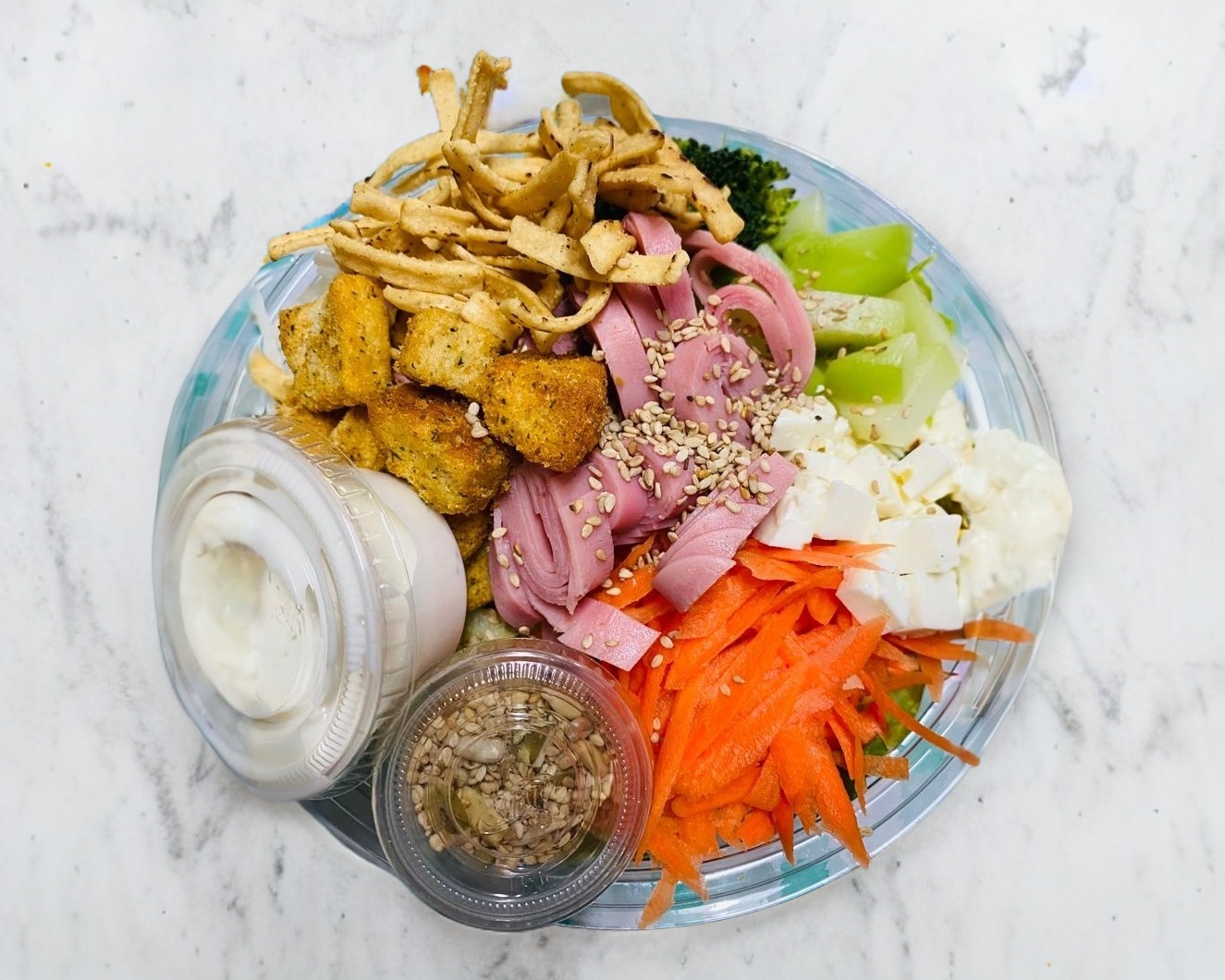 Lechuga, zanahoria, pepíno,brocoli, chayote, jamaica, queso fresco, crotone, totopos y mix de semillas(proteina y aderezo a elegir)