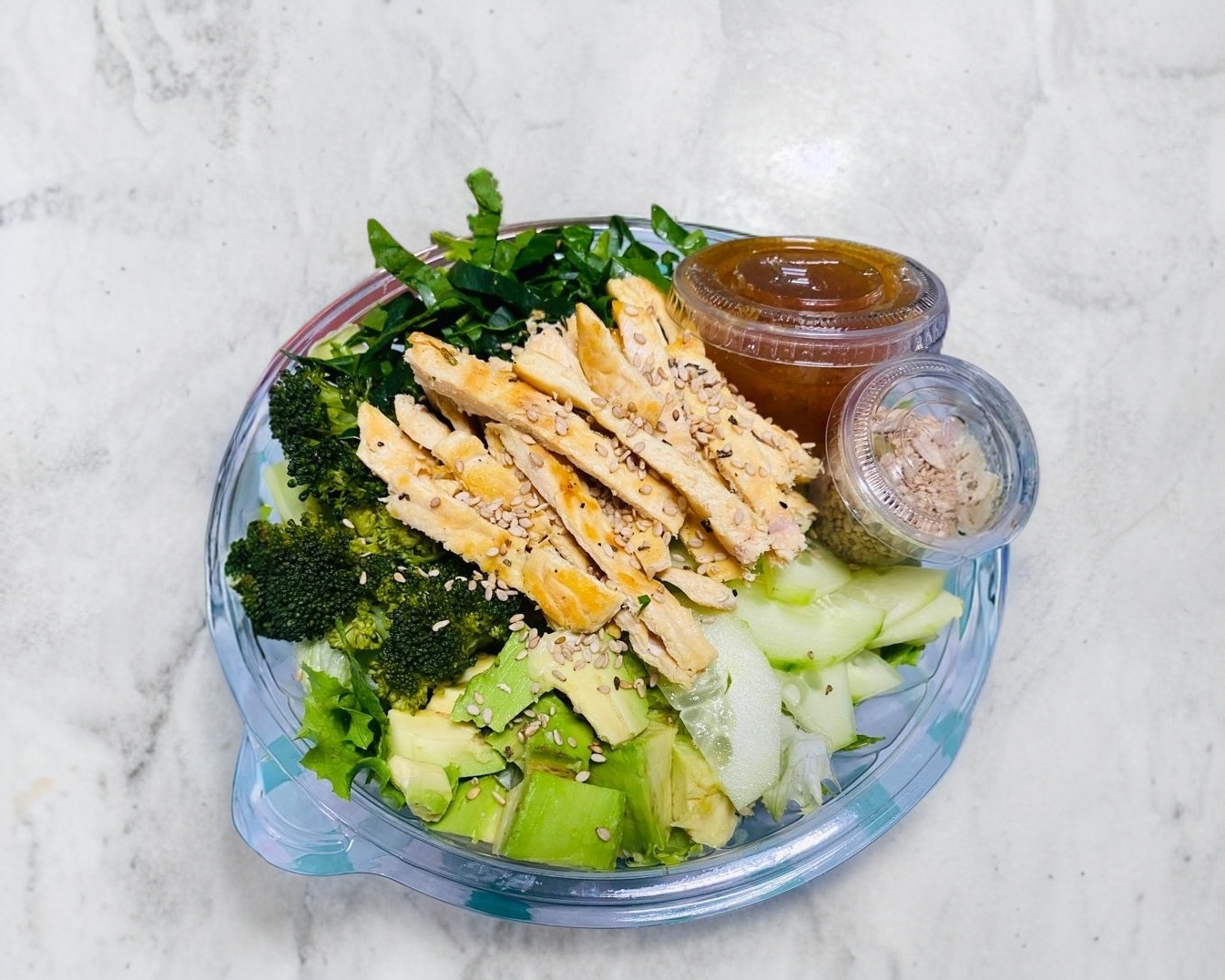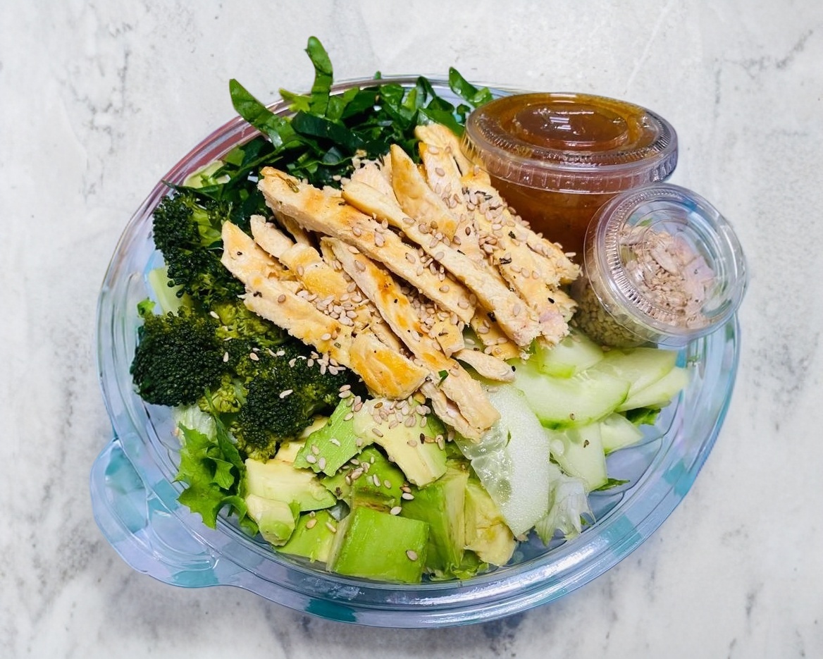 Lechuga, brocoli, chayote, pepino, aguacate, espinaca, semilla de girasol, pepitas (proteina y aderezo a elegir)