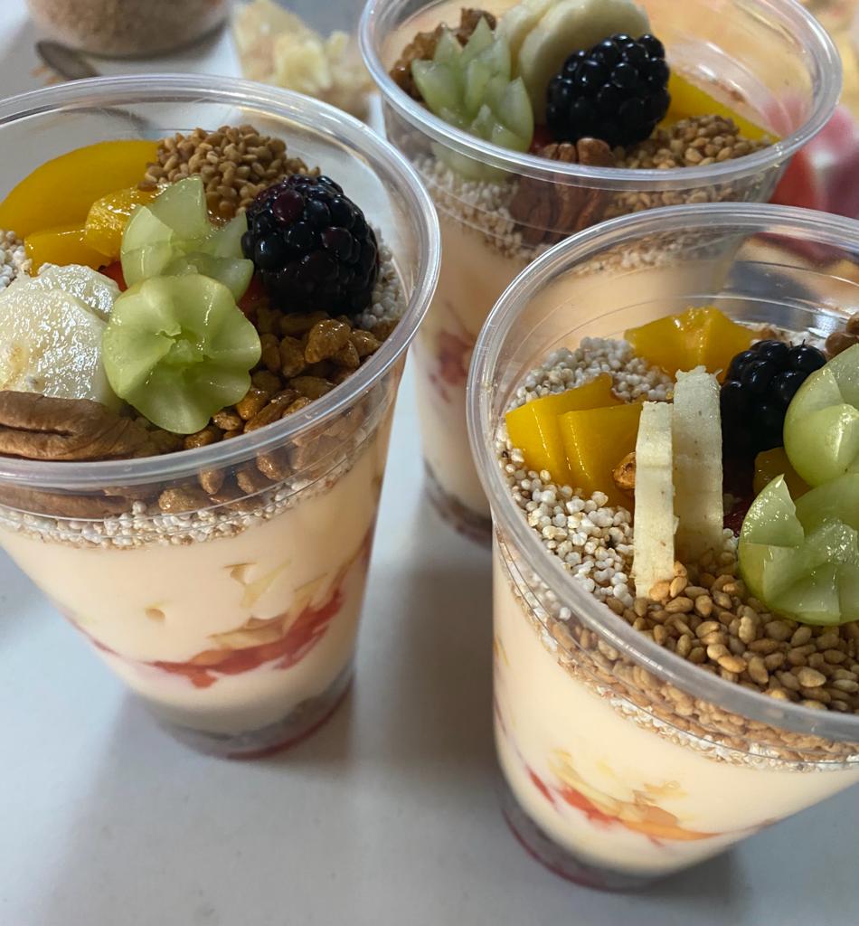 Coctel de Frutas con Miel, Granola y Crema Batida