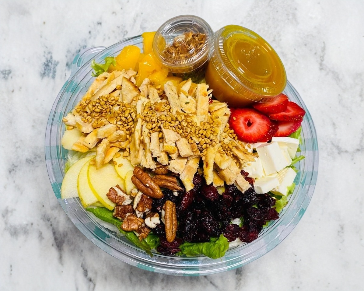 Lechuga, arandano, manzana, nuez, fresa, queso fresco, fruta de temporada, granda dulce(proteina y aderezo a elegir)