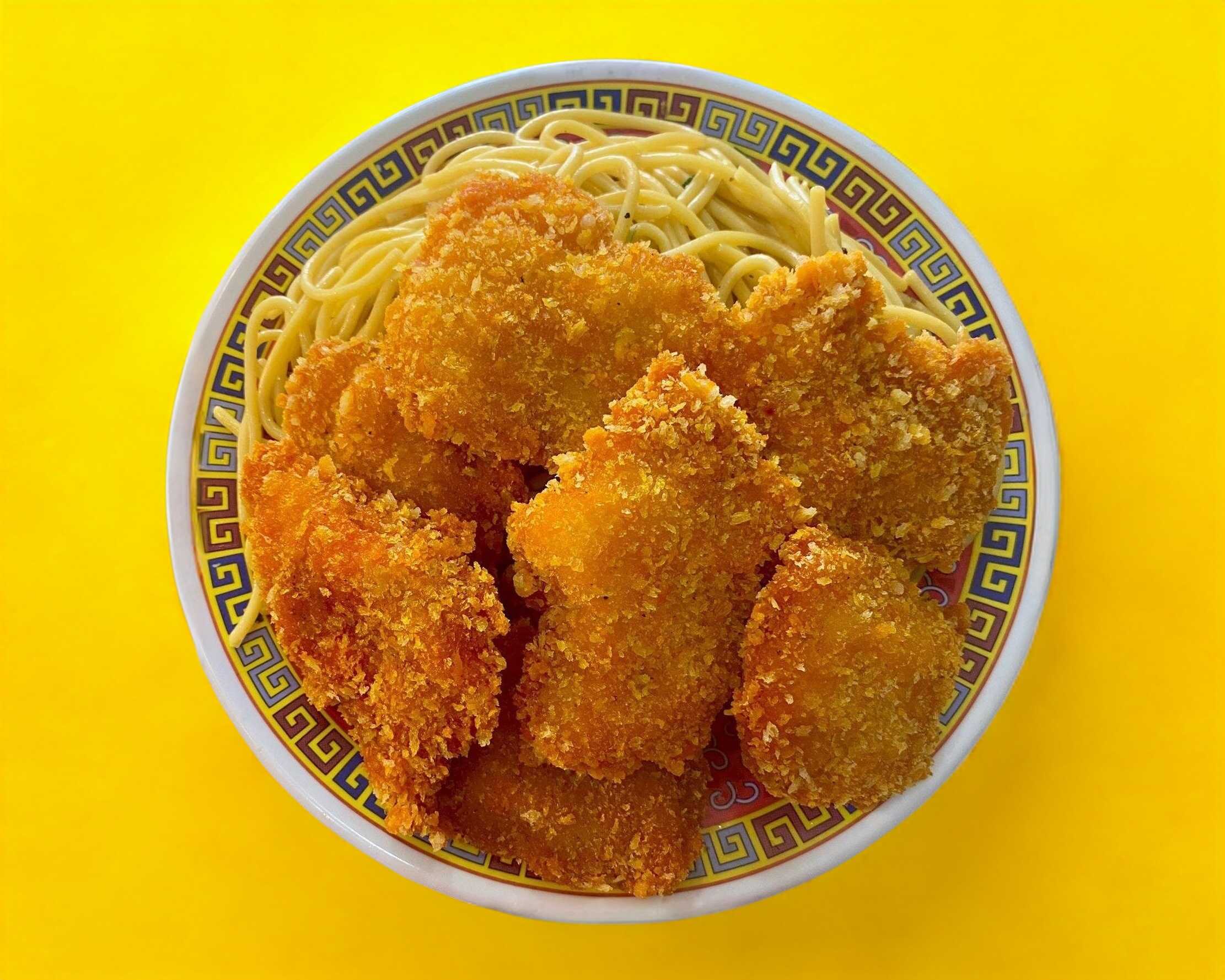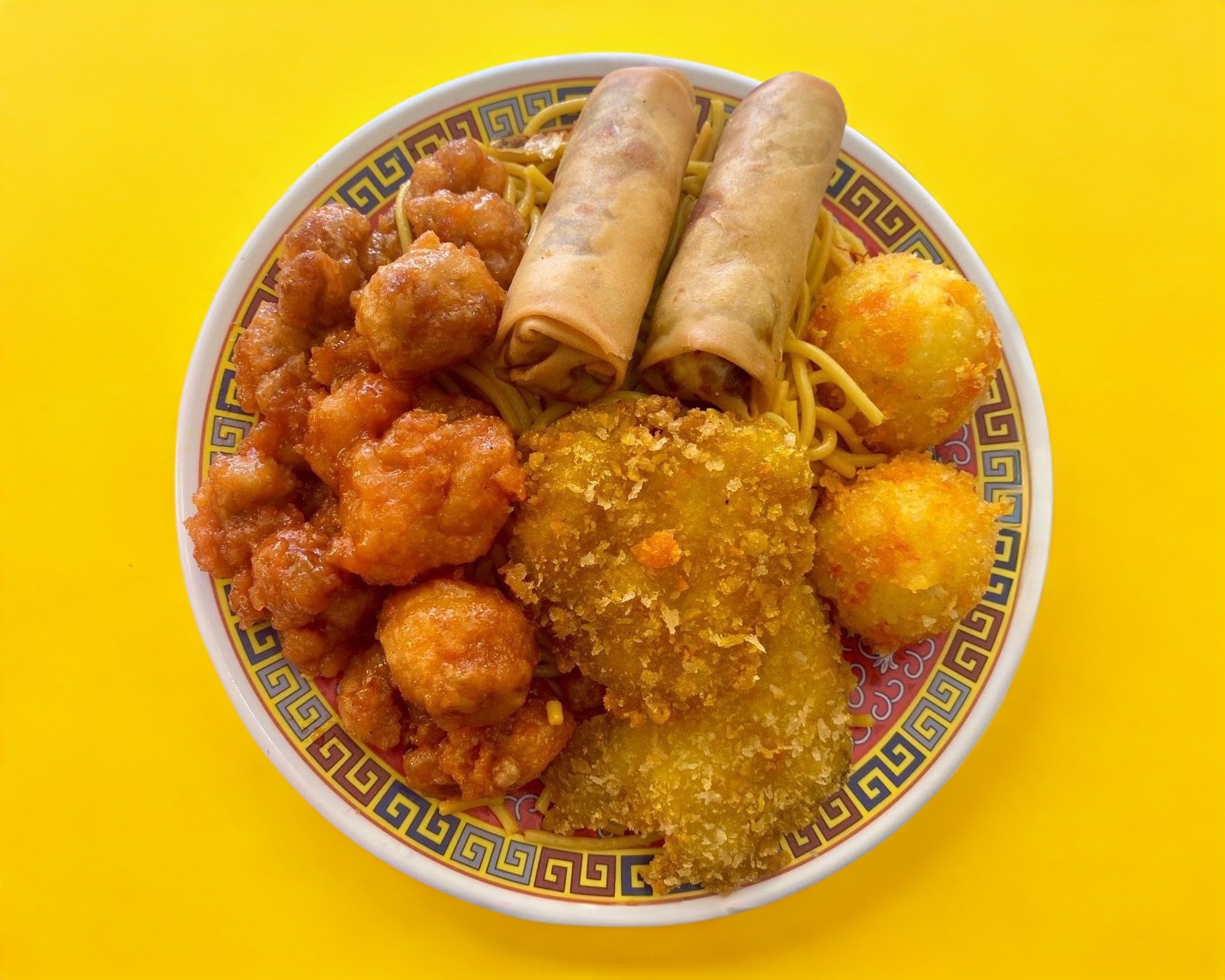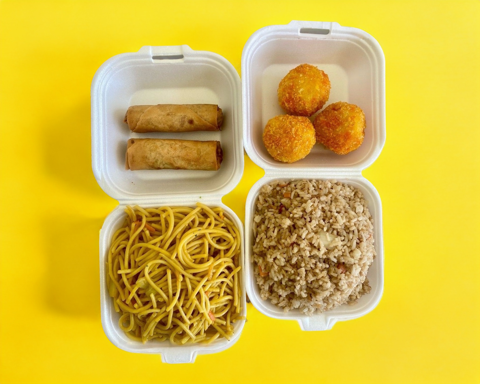 Arroz o Pasta 2pz rollitos primavera(Queso y zanahorias) ,2pz bolas de sushi ,2pz pescado frito, pollo agridulce