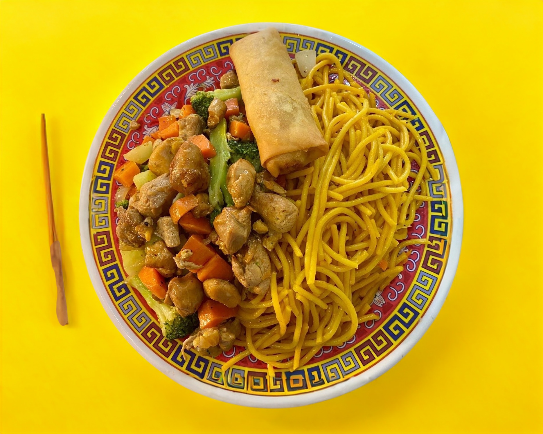 Arroz o Pasta pollo con Verduras 1 pz rollito primavera(Queso y zanahorias)