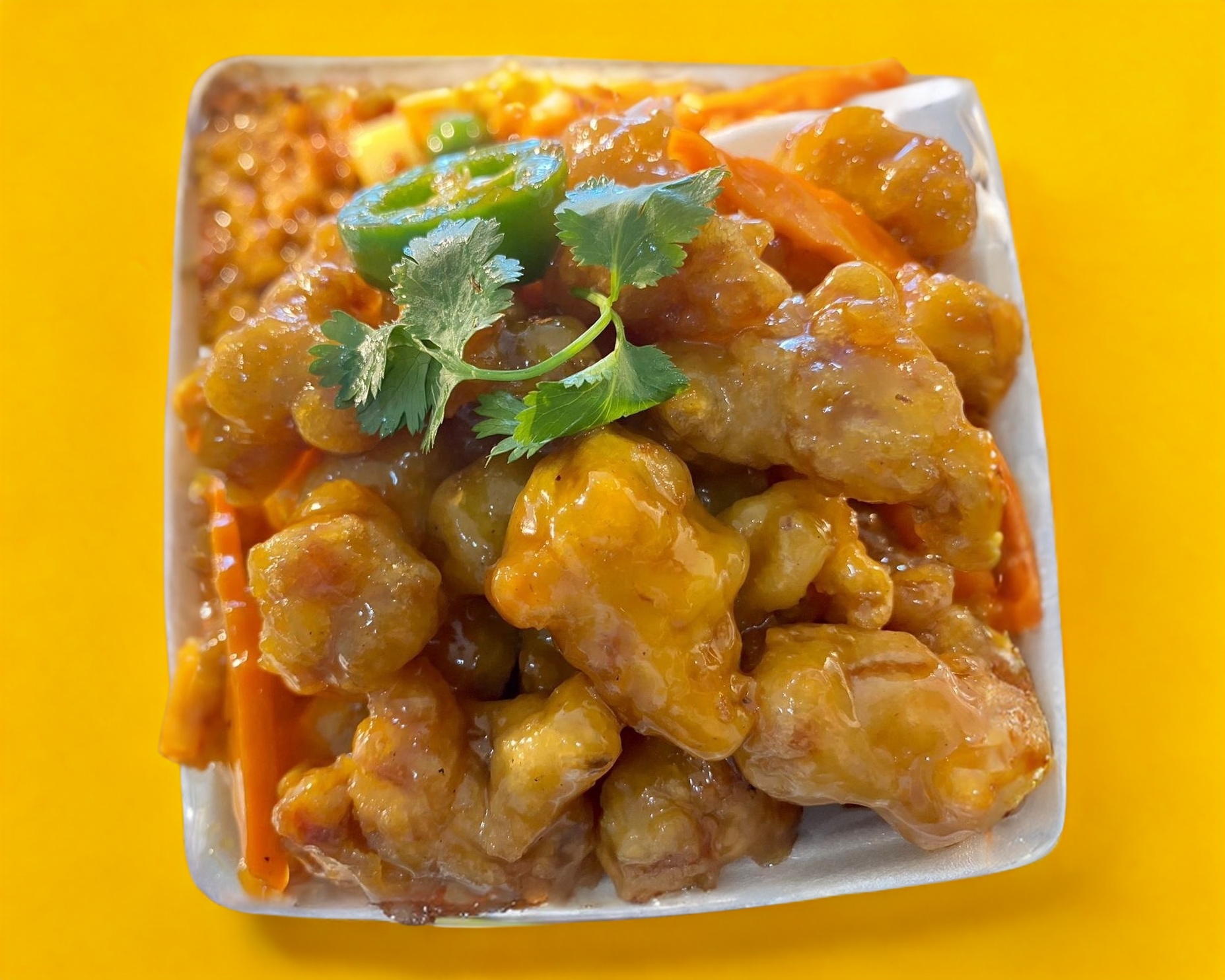 Arroz o Pasta pollo agridulce poco picante, brócoli con res 1 pz rollito primavera (Queso y zanahorias)1 pz sushi de bolas