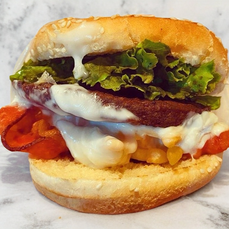 Sirloin, tocino, jamón, queso manchego, deliciosa salsa BBQ.