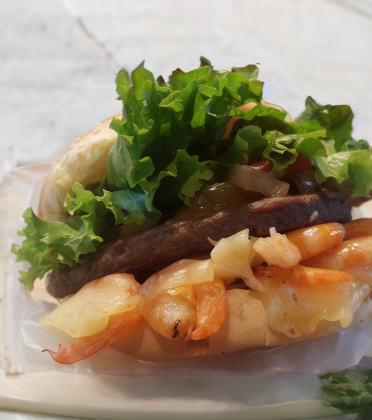 Camarones gratinados bañada en suculenta salsa de parmesano, mas una rebanada de piña con tocino.