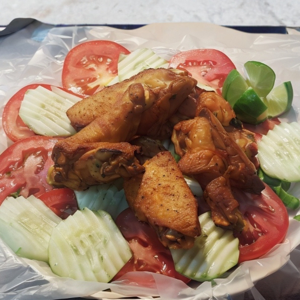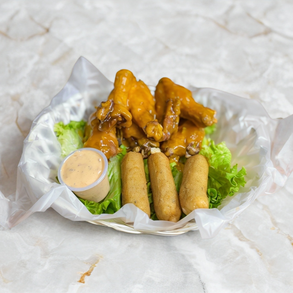 Delicioso medallón de vegetales bañada con nuestra picosita salsa delic wings y queso Oaxaca.
