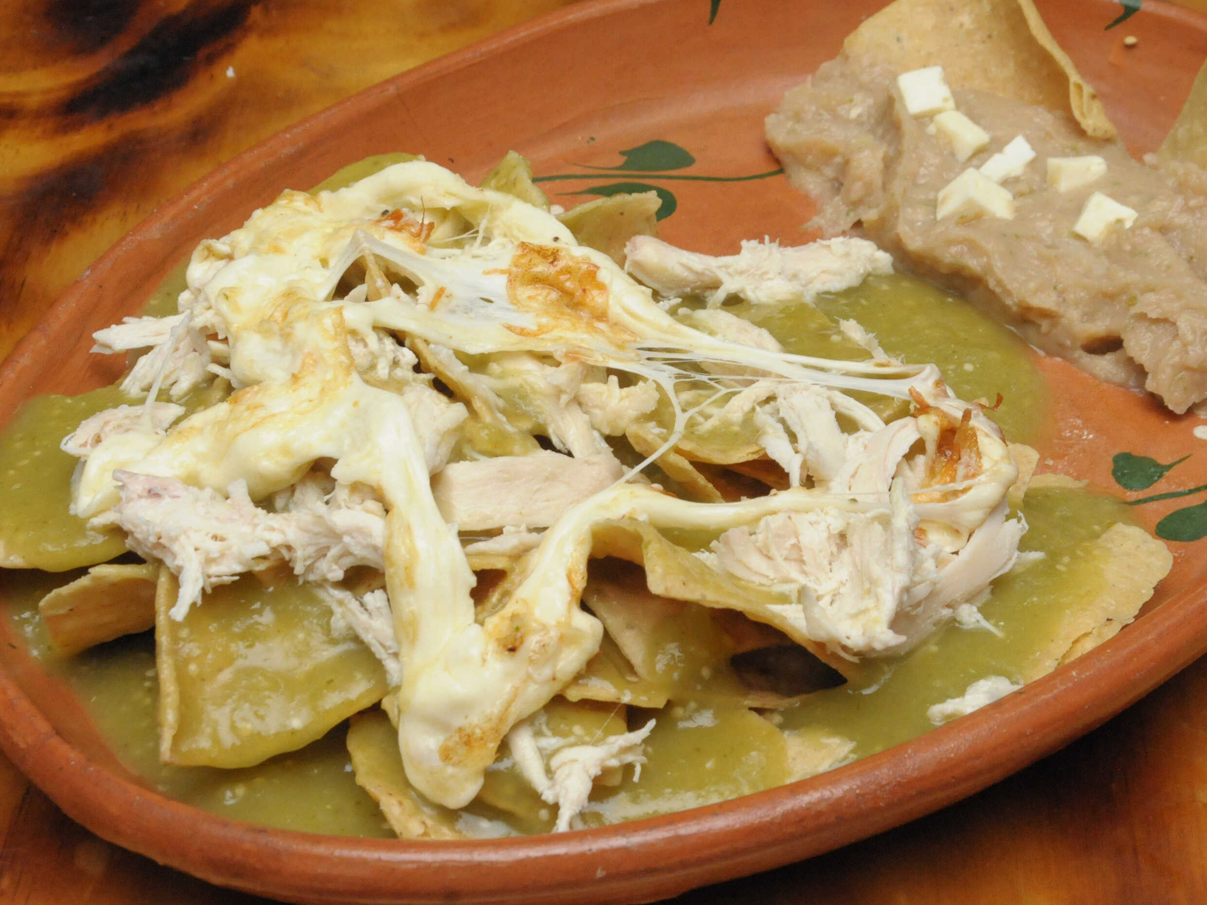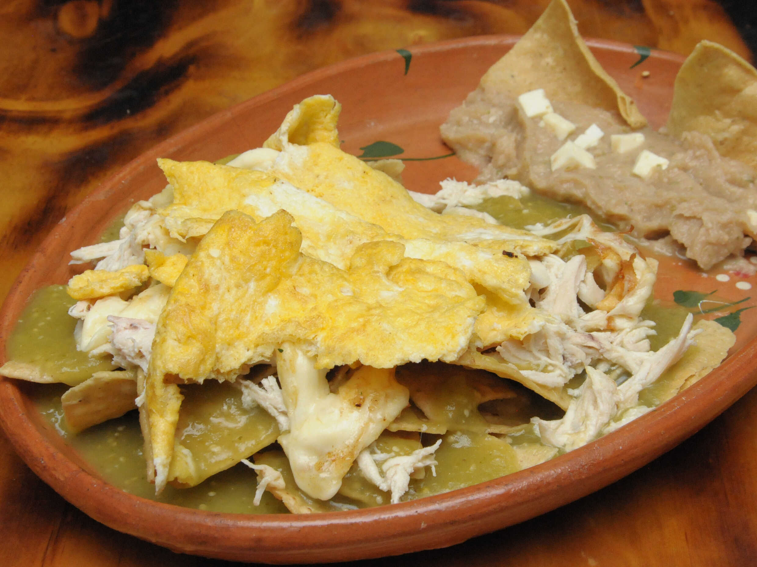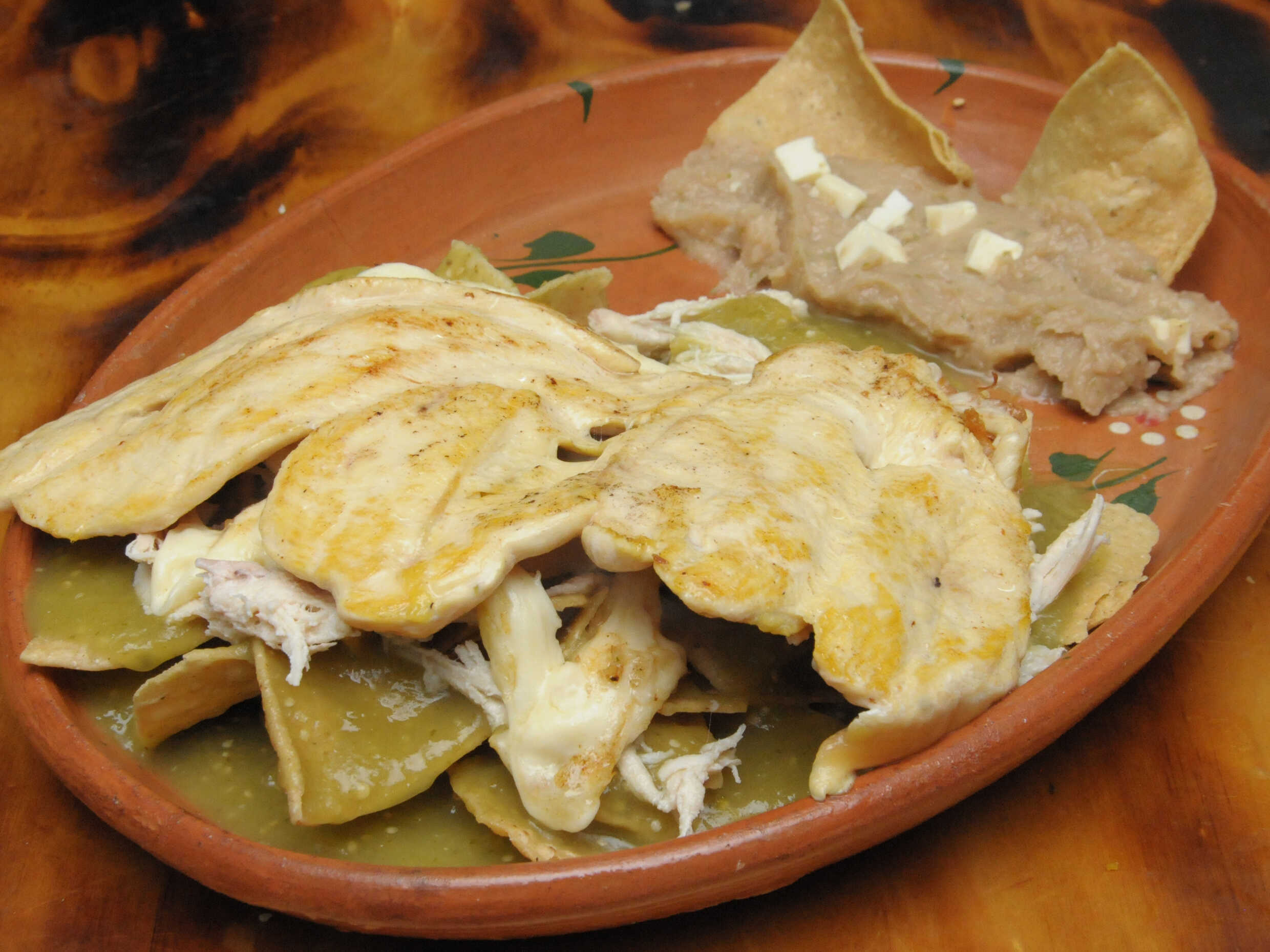 Tortillas fritas con pollo y dos huevos estrellados, queso gratinado (500g) y crema, con frijoles refritos.
