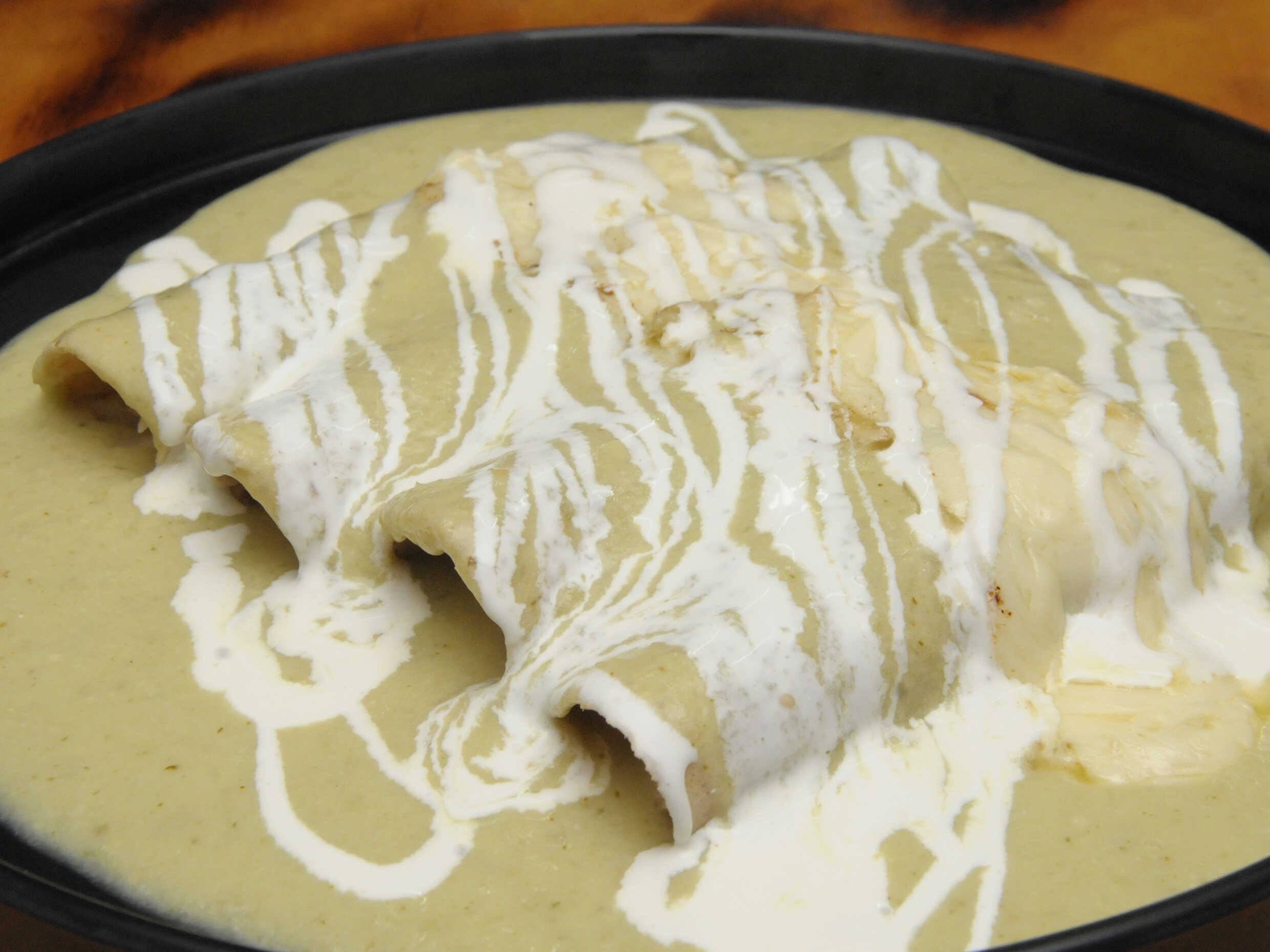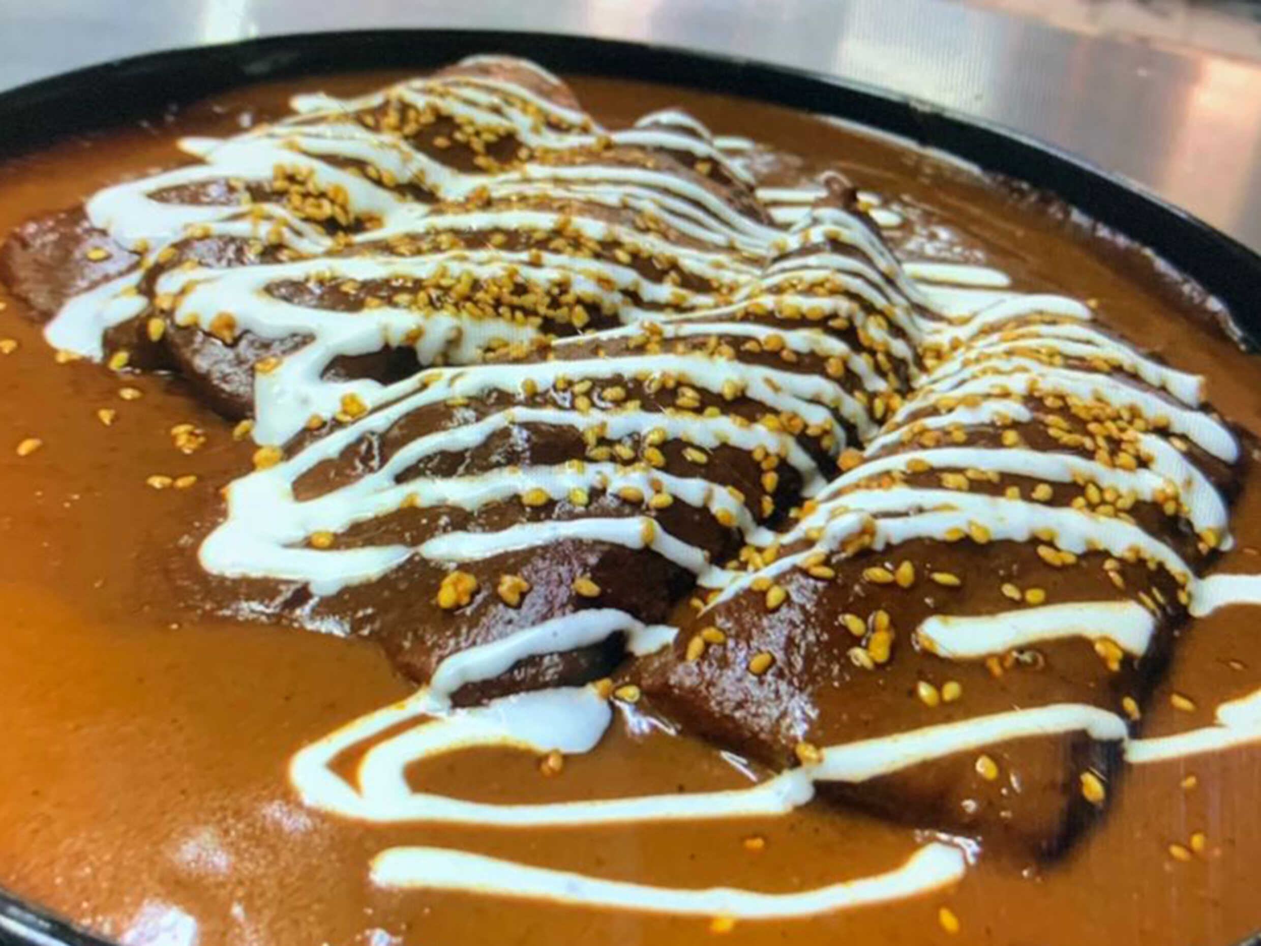 Delicioso mole de la casa, rellenos de pollo desmenuzado, crema, ajonjolí caramelizado.