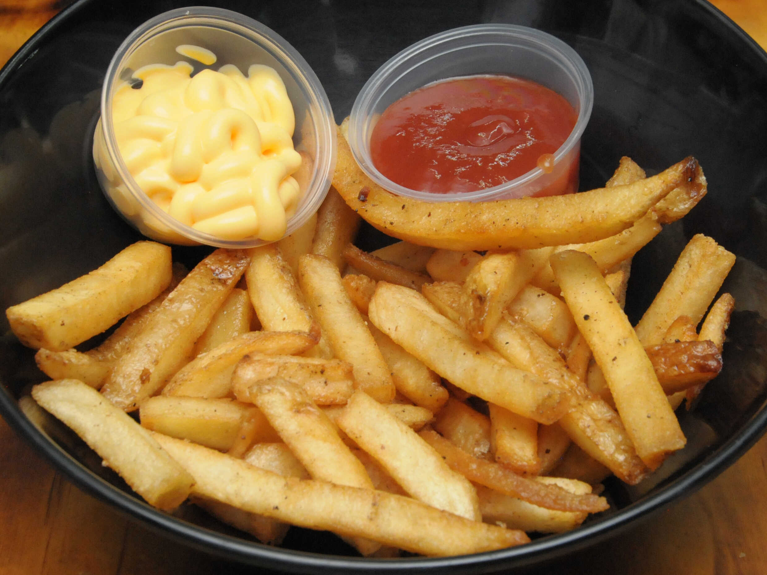 Tenders con queso oaxaca y frijoles, Acompañado de papas a la francesa