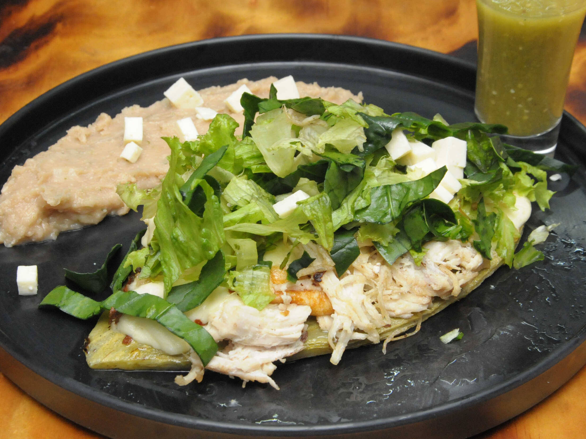 Relleno de pollo desmenuzado, queso panela, bañados en mole de la casa. Acompañado de frijoles refritos. Incluye te y fruta de la estación.