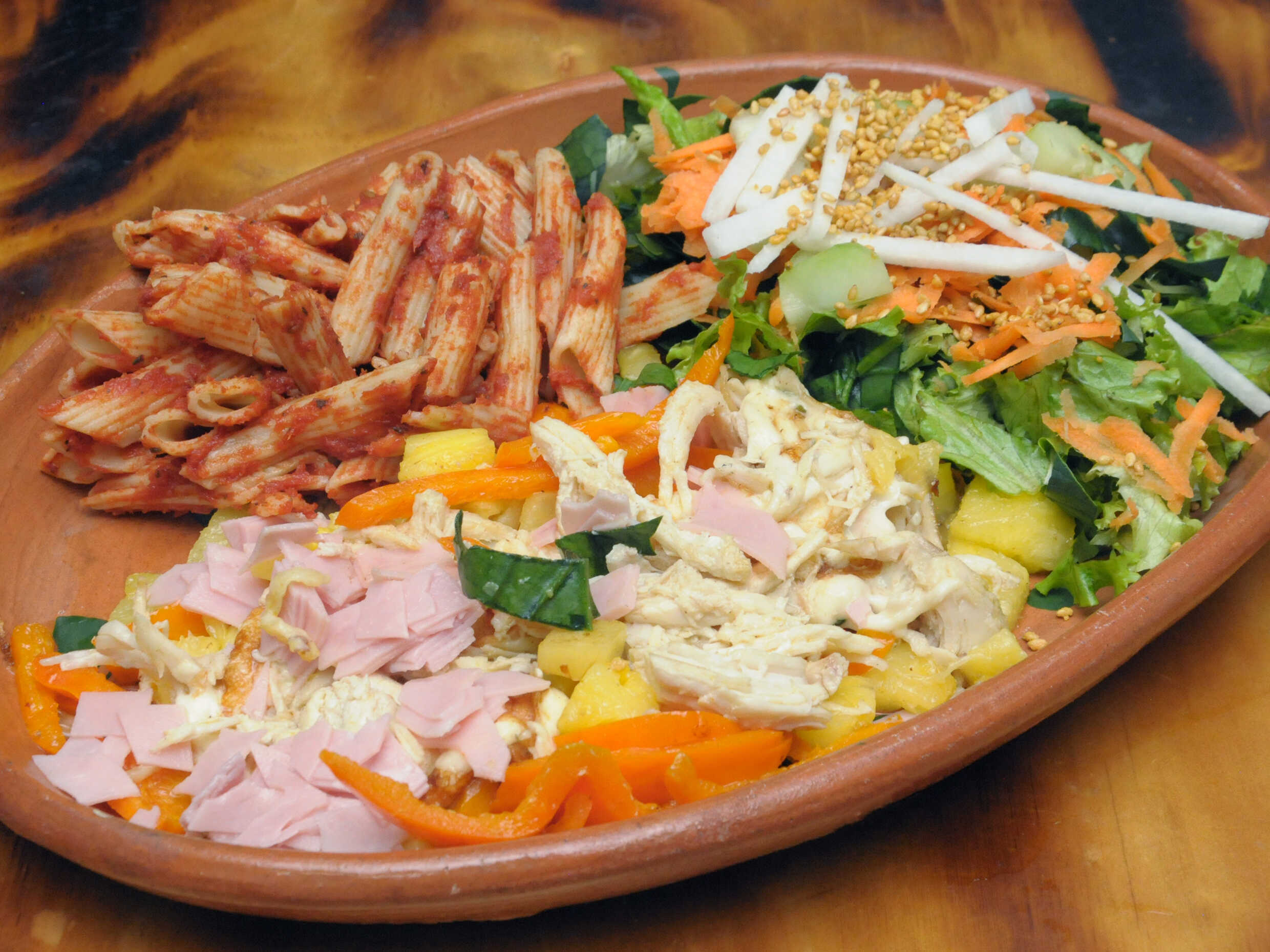 Base de lechuga, queso panela, manchego, jamón de pavo, manzana, durazno en almibar, pepino, nuez y almendras