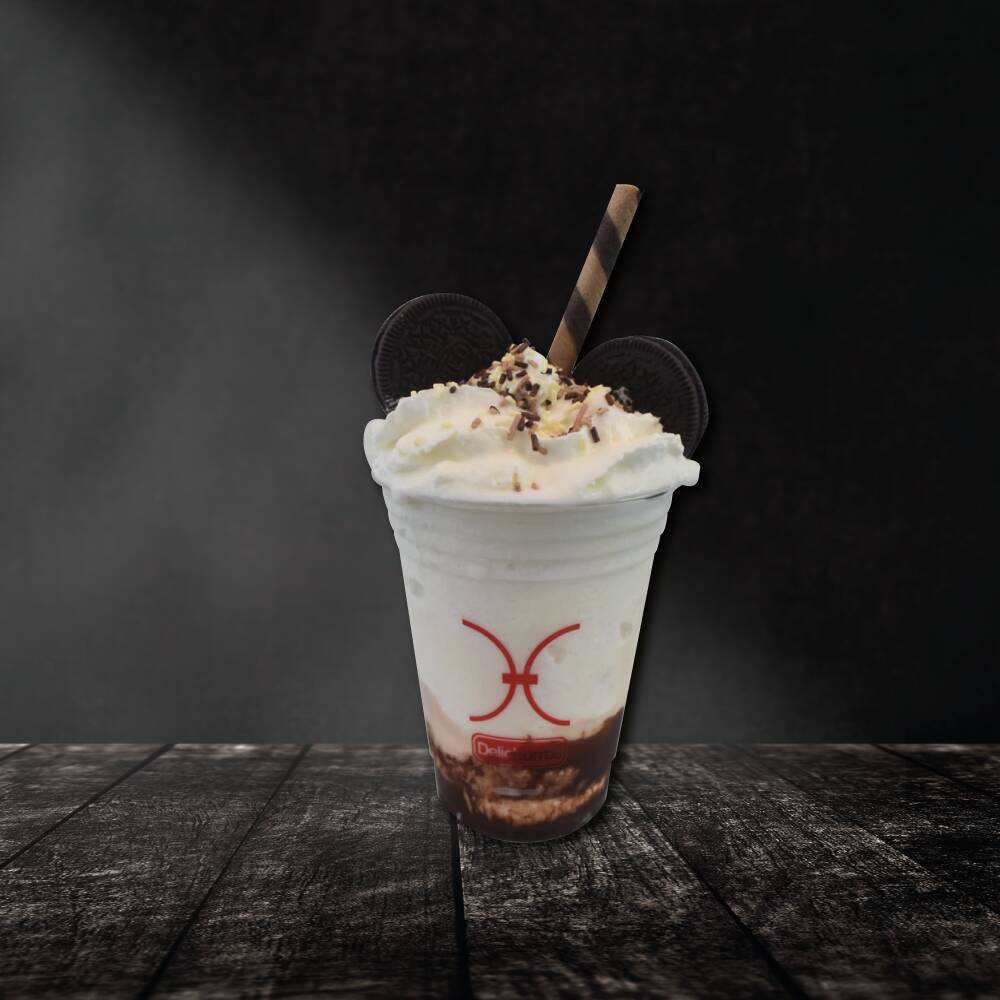 Bebida con leche, hielo triturado, sabor a elegir y decoración de crema batida y galletas.
