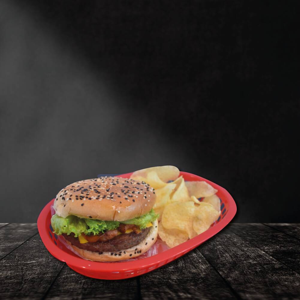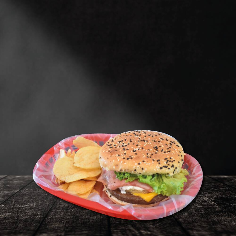 Jugosa carne de res o pollo, con tiras de tocino ahumado, lechuga, jitomate, cebolla, chile jalapeño, queso amarillo, aderezos de la casa y acompañada de papas fritas.