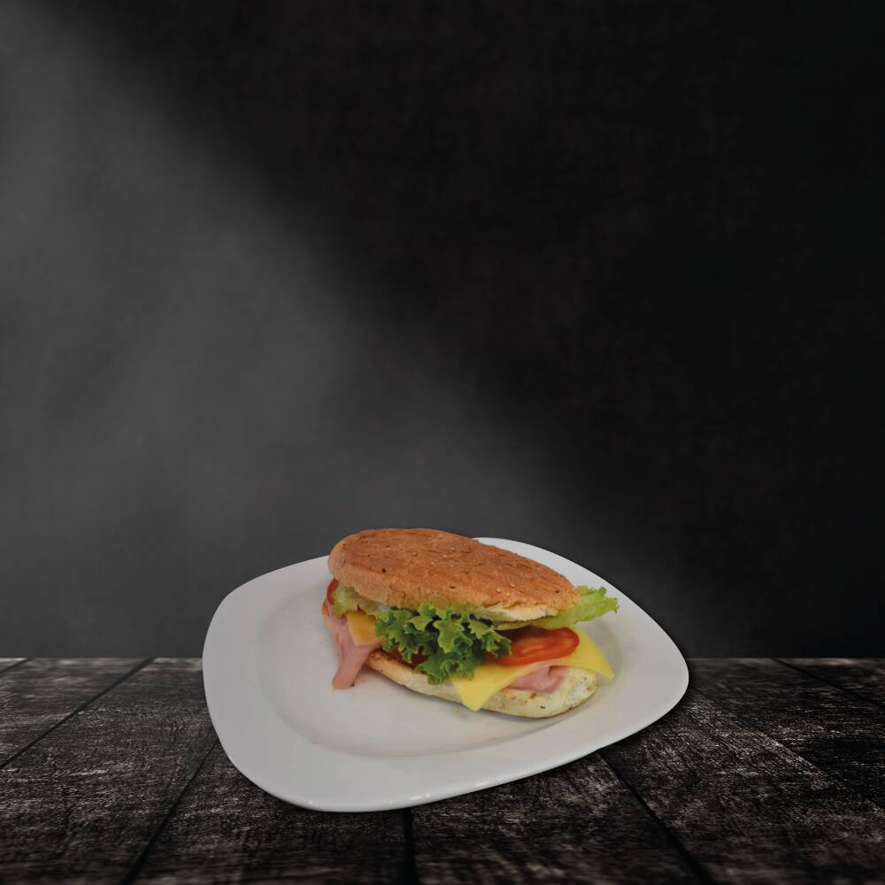 Pan tipo chapata, de jamón y queso manchego, mayonesa, jitomate y lechuga.