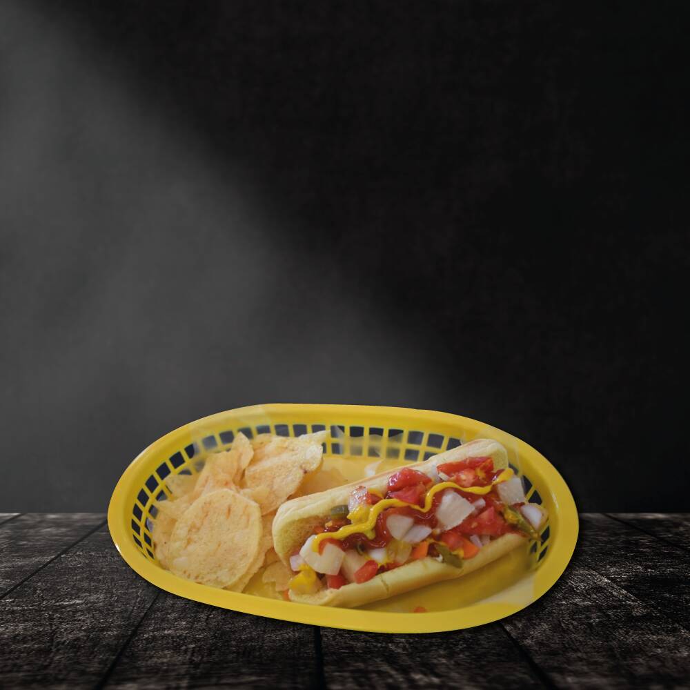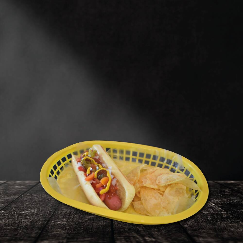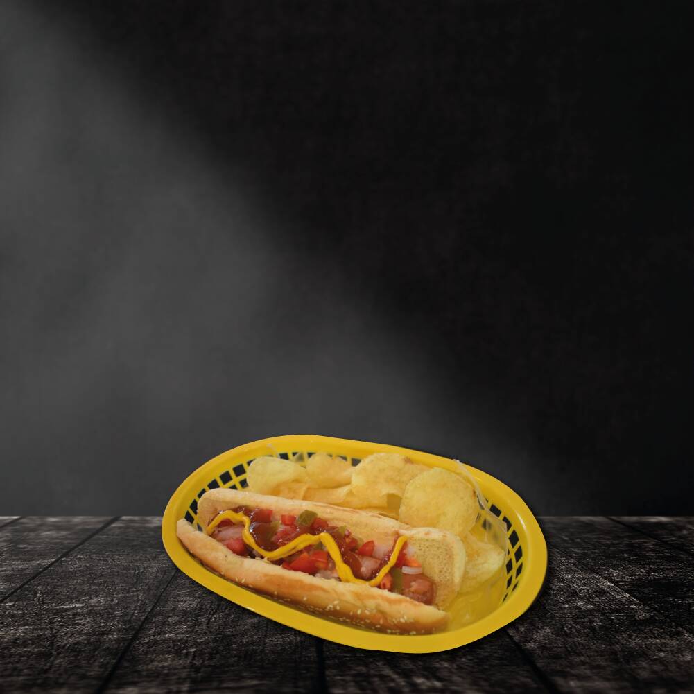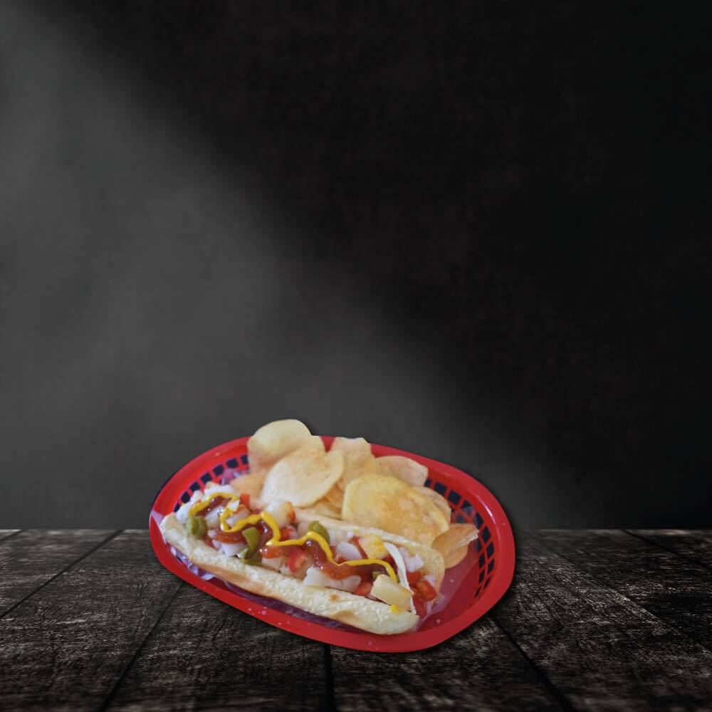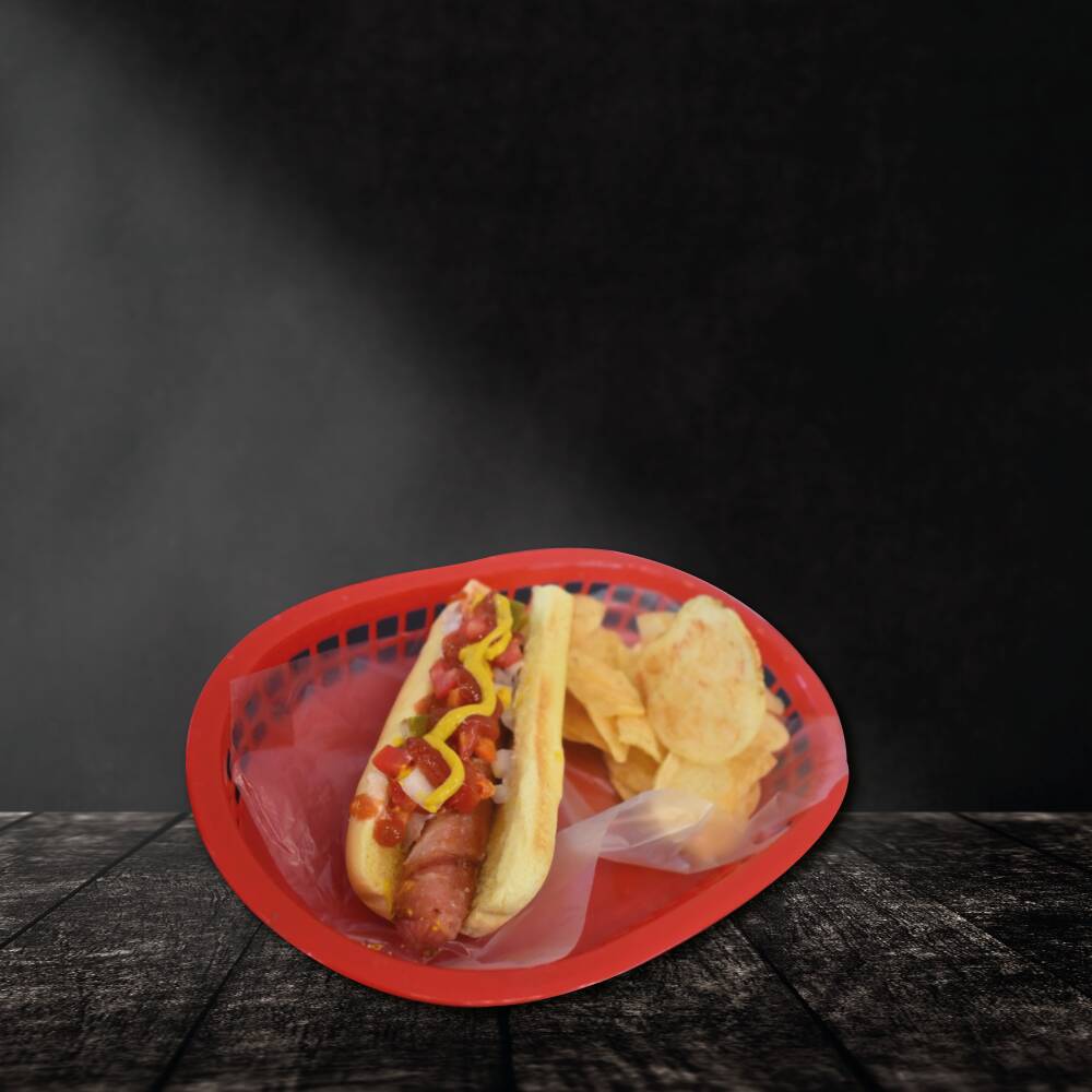 Salchicha a la plancha cubierta con tocino, con cebolla, jitomate, chile jalapeño, aderezos de la casa y acompañado con papas fritas.