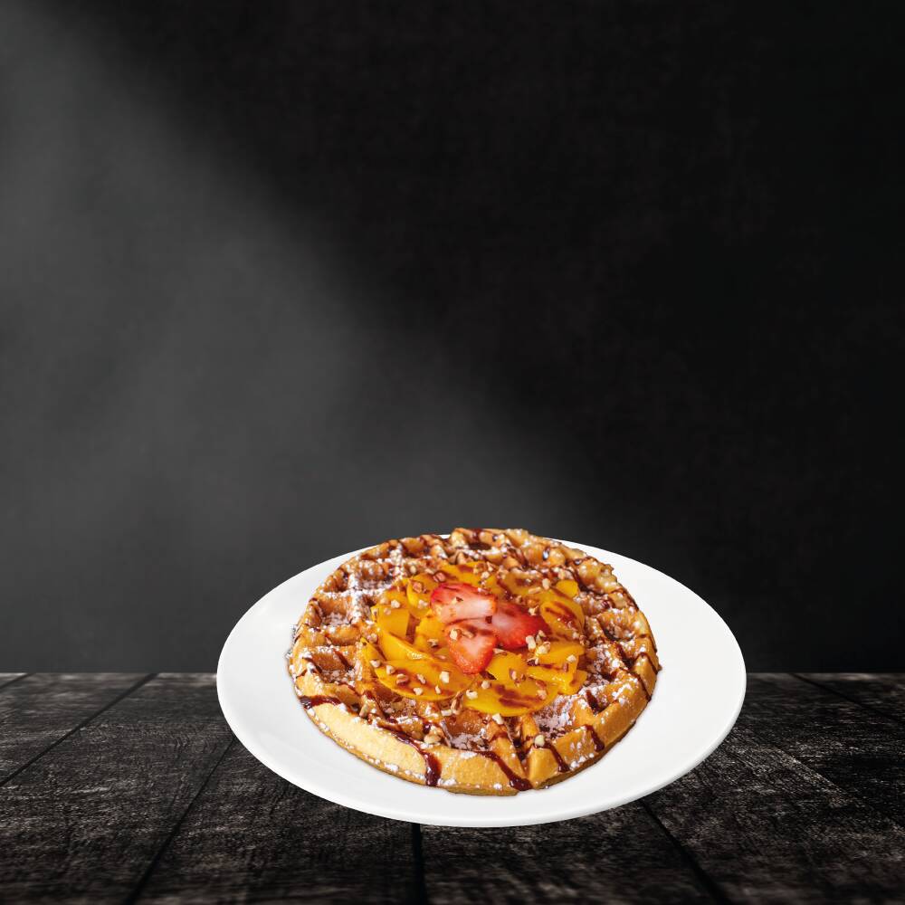 Delicioso waffle bañado con la mermelada de tu preferencia y trocitos de fruta.