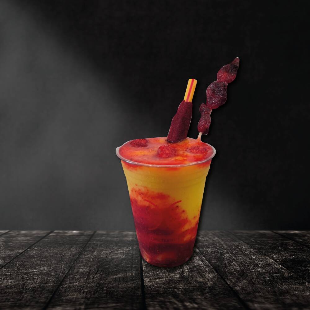 Bebida refrescante y picosita, elaborada con hielo, concentrado de fruta, chamoy, tajín, miguelito y gomitas.