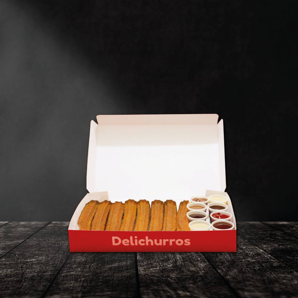 Paquete de 8 churros rellenos, espolvoreados con azúcar y canela, acompañados de mermeladas, sabores a elegir.