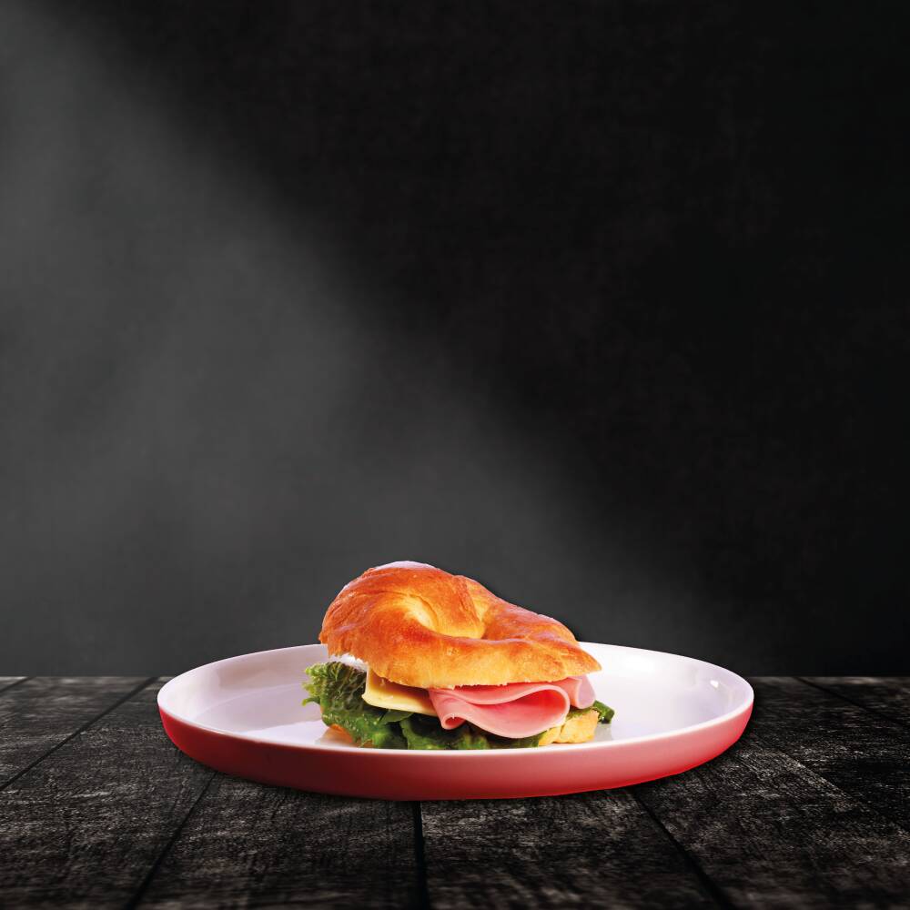Cuernito de jamón y queso manchego, con mayonesa, jitomate y lechuga.