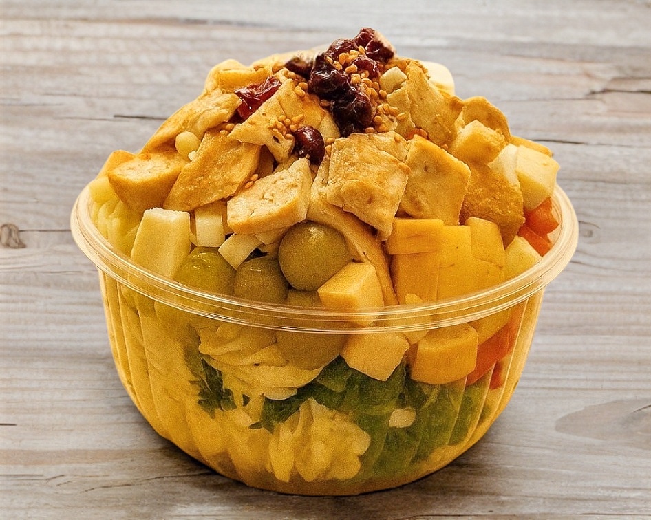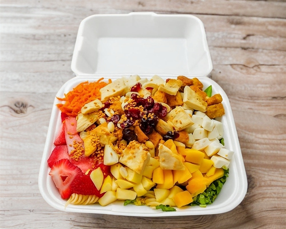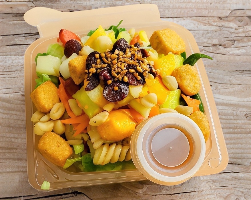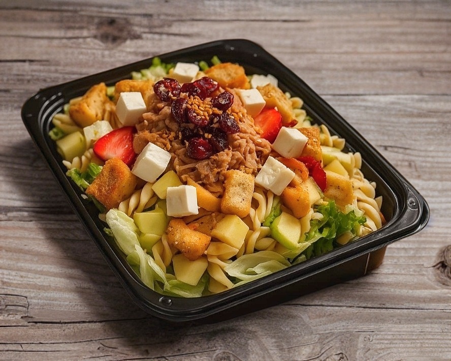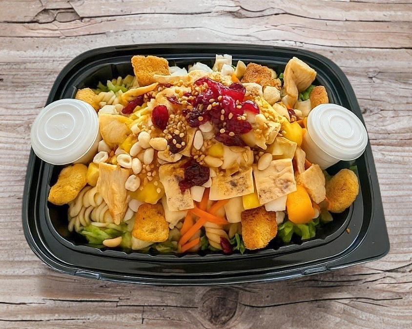 (Personal) Una deliciosa mezcla de lechuga italiana y romana, espinaca, pasta de tornillo, jícama, zanahoria y frutas frescas como fresa, manzana, mango o uva (dependiendo la temporada). Acompañada de crutones, cacahuates, arándanos y ajonjolí caramelizado. Todo esto se completa con una fresca porción de dos proteínas de su gusto y un aderezo de su elección.