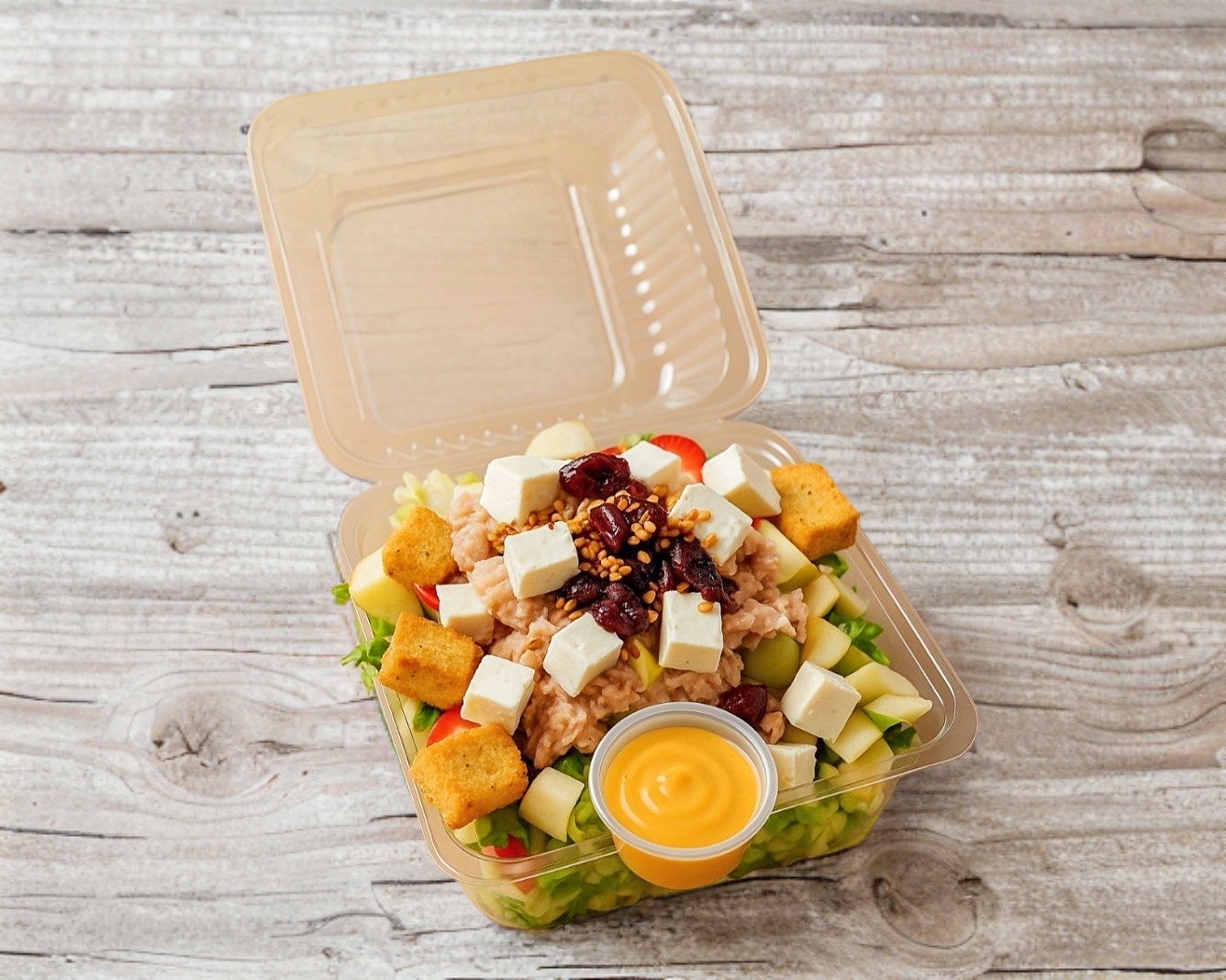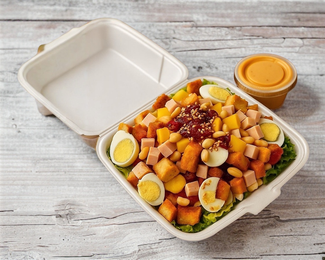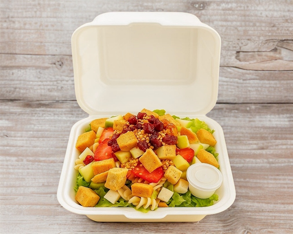 (Personal) Una deliciosa mezcla de lechuga italiana y romana, espinaca, pasta de tornillo, jícama, zanahoria y frutas frescas como fresa, manzana, mango o uva (dependiendo la temporada). Acompañada de crutones, cacahuates, arándanos y ajonjolí caramelizado. Todo esto se completa con una fresca porción de dos proteínas de su gusto y un aderezo de su elección.