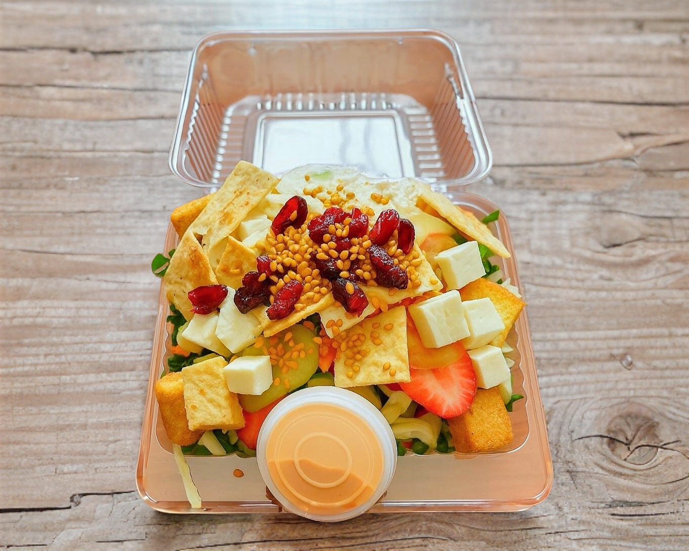 (Personal) Una deliciosa mezcla de lechuga italiana y romana, espinaca, pasta de tornillo, jícama, zanahoria y frutas frescas como fresa, manzana, mango o uva (dependiendo la temporada). Acompañada de crutones, cacahuates, arándanos y ajonjolí caramelizado. y un aderezo grande de su elección.