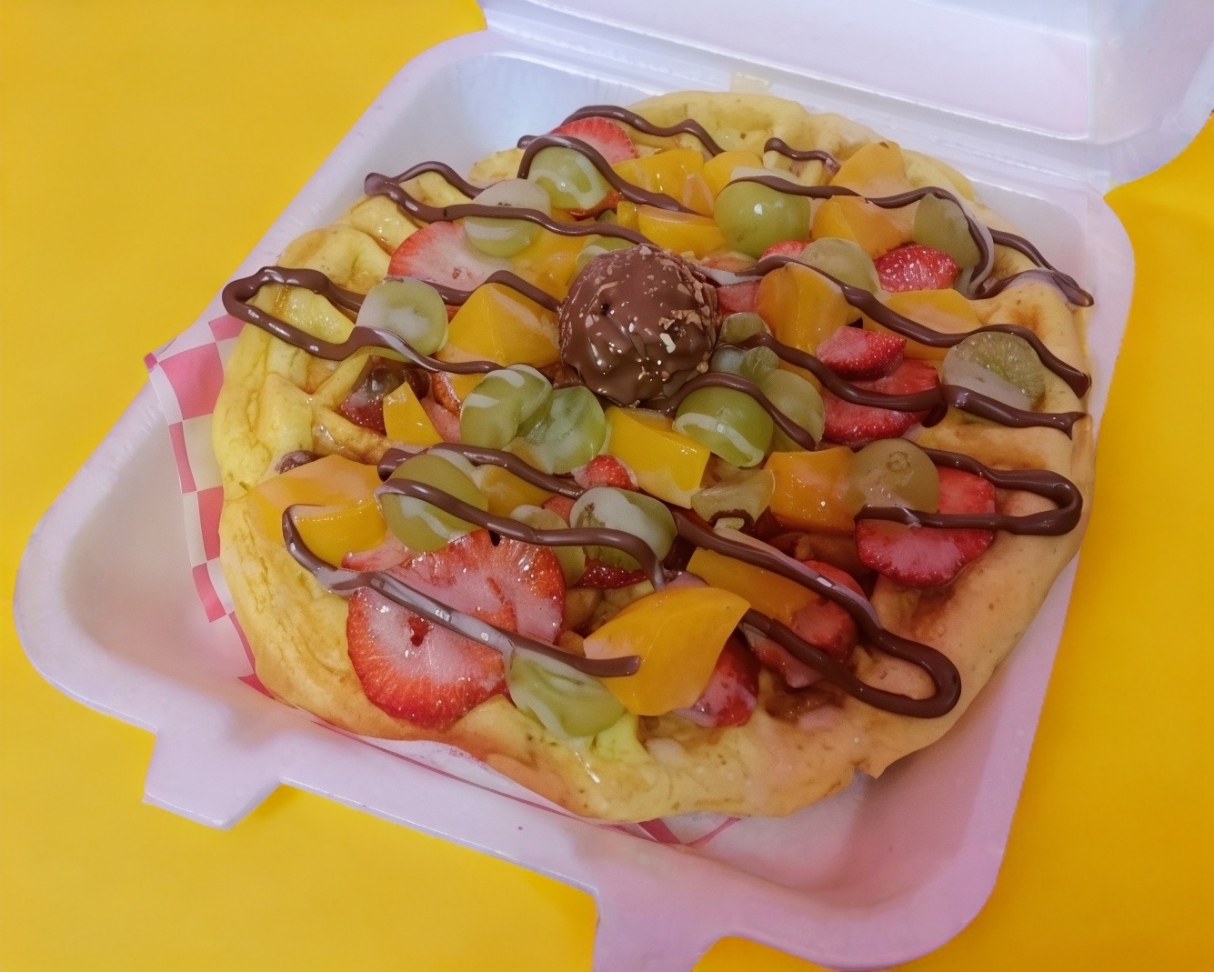Waffle grande, fresa, uva y durazno, con Nutella, lechera y ferrero