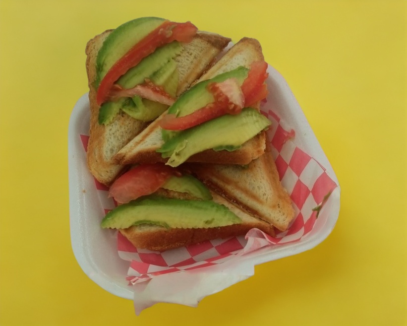 Sándwich triple pan con lechuga, aguacate y jitomate, con jamón, pierna, salchicha o pechuga, es al gusto