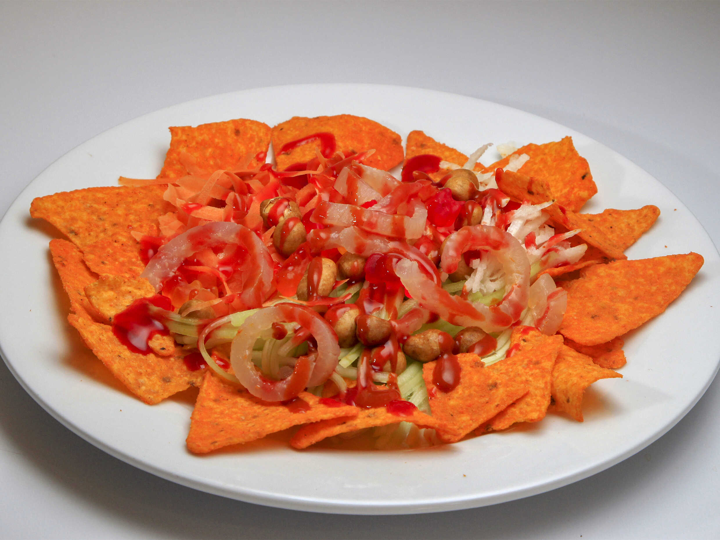 Doritos nachos con gomitas de osito, cacahuates, cueritos, pepino, zanahoria, jícama, chamoy, miguelito, limón y salsa picante.