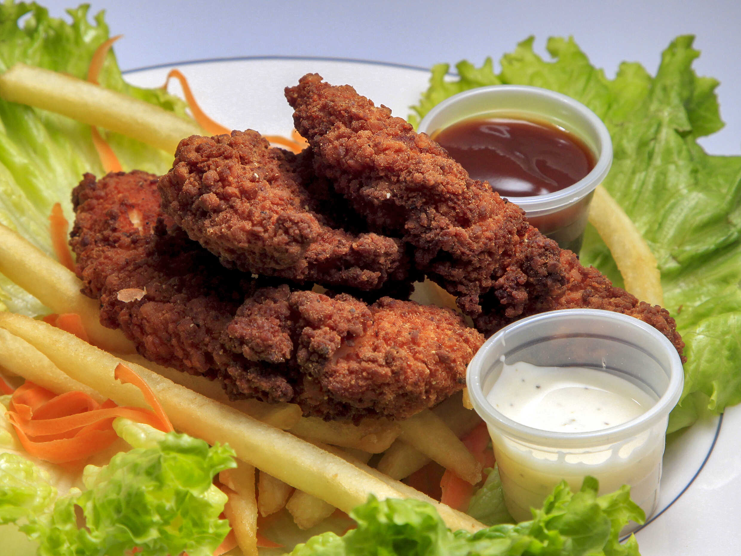 Tiras de pollo con cama de lechuga, acompañadas de papas a la francesa.