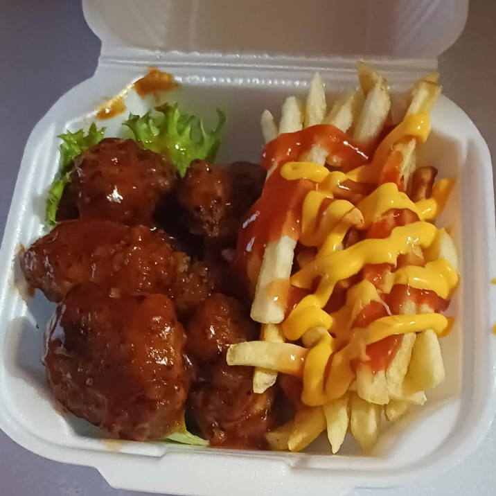 Orden de alitas fritas con una cama de lechuga, salsa maggi con inglesa,tajin y limón