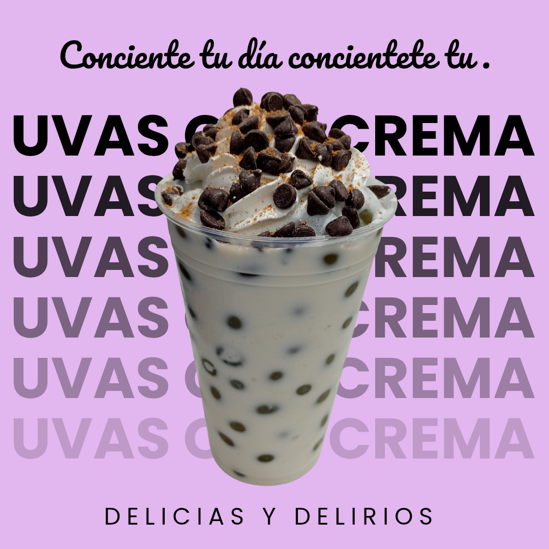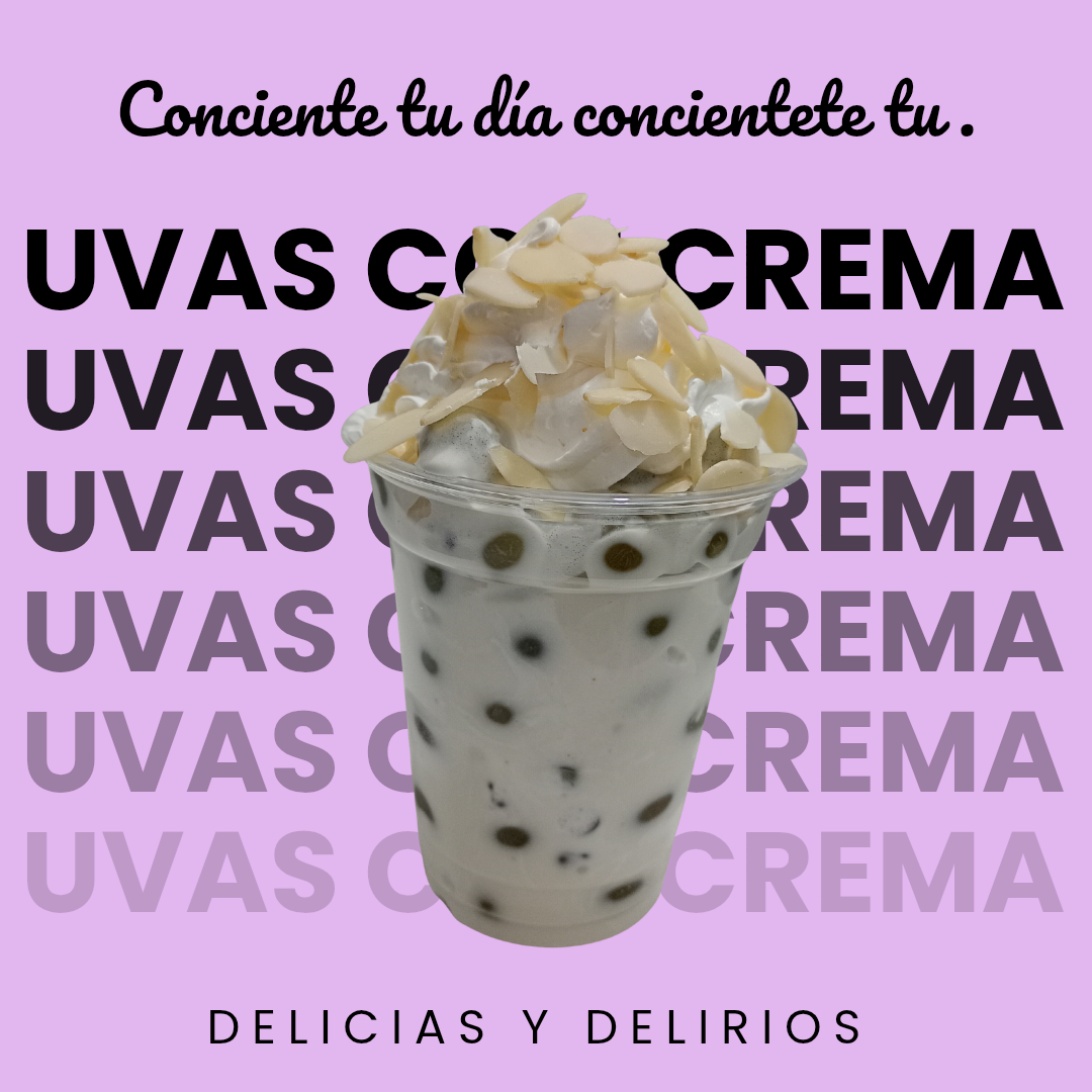 Vaso de 12oz de unas deliciosas uvas con crema acompañadas de 1 jarabe 2 toppings y coronada de crema batida