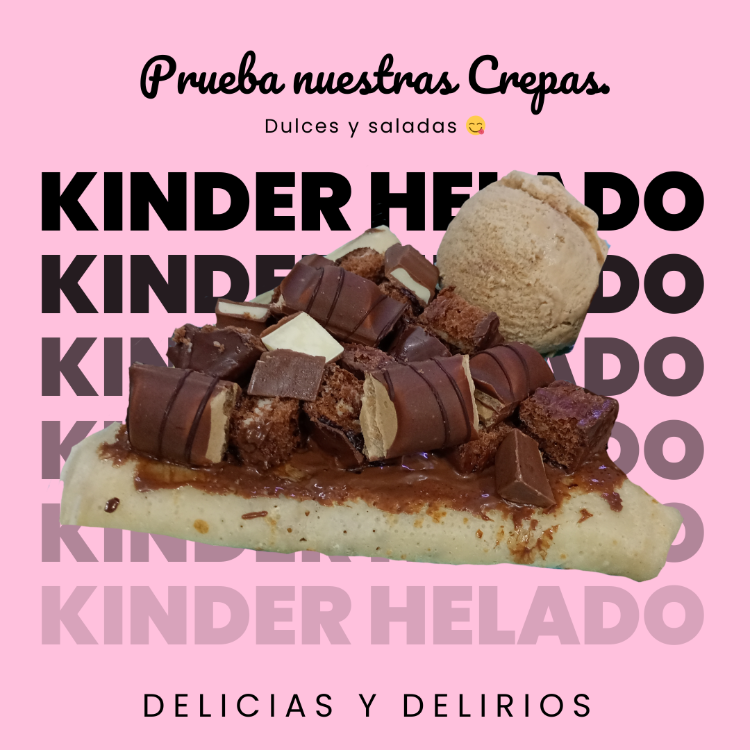 Chocolatosa pero no empalagosa crepa rellena de nutella coronada con un kinder delice un kinder bueno un kinder max y una bola de helado de tu elección