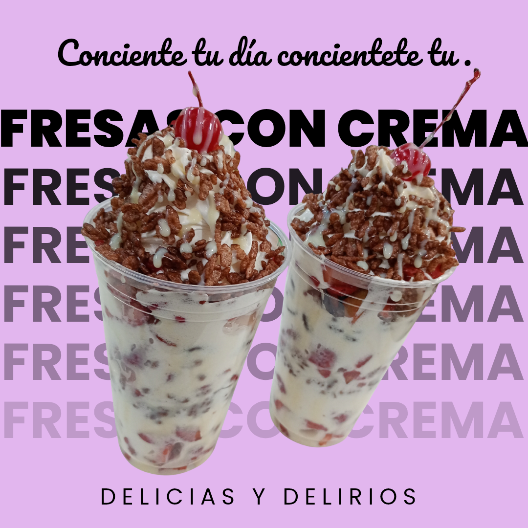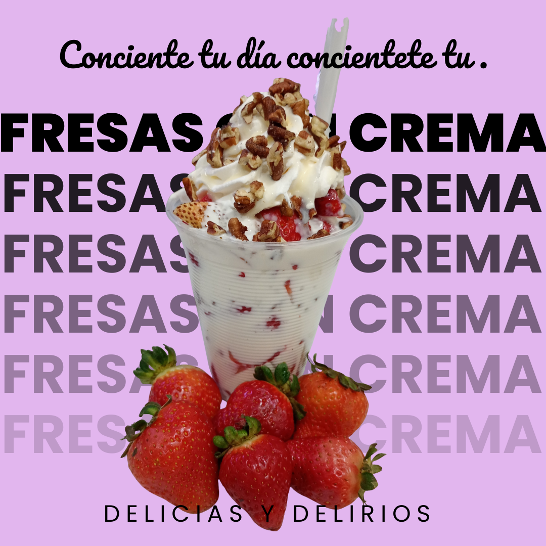 Deliciosas fresas con crema frescas acompañadas de 1 jarabe 3 toppings y coronadas de crema batida
