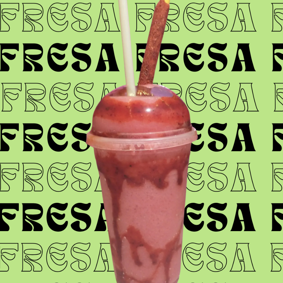 Refresante bebida fria picosita del sabor de tu elección acompañada de chamoy miguelito natural y banderilla de chile con pulpa de tamarindo o mango