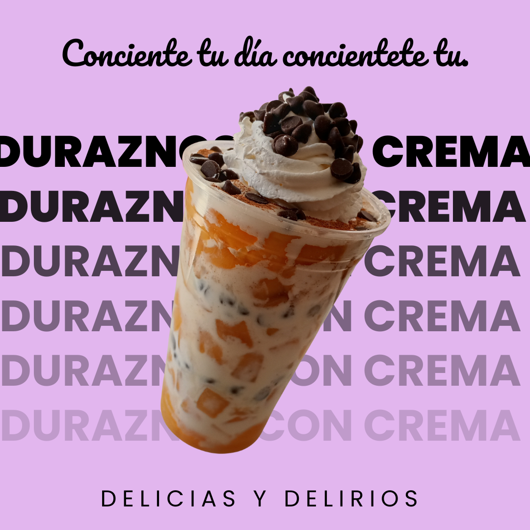 Vaso de duraznos con crema de 12oz acompañado de 1 jarabe 2 toppings y coronado de crema batida