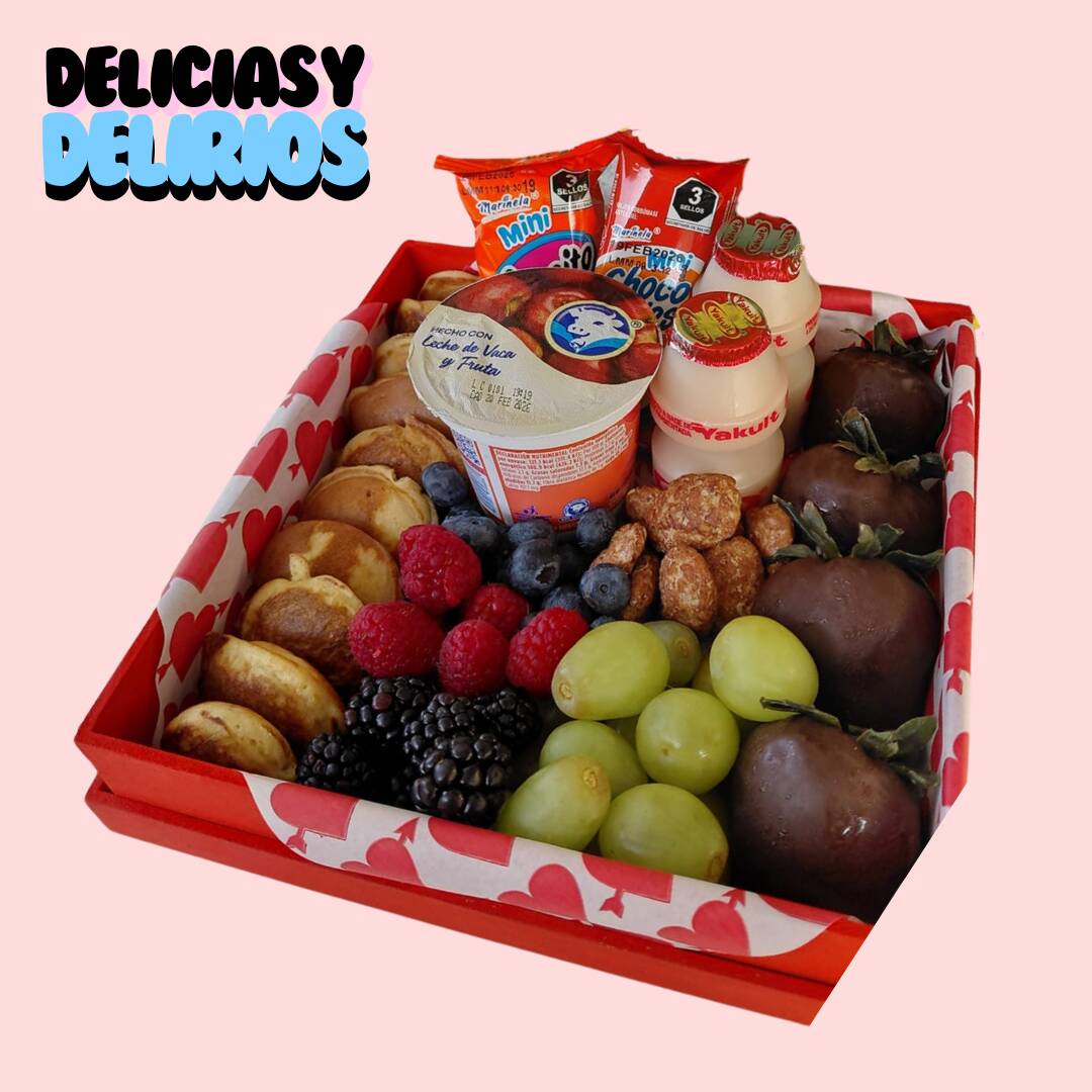 Caja de madera con 12 mini hot cakes 2 yakults 2 Mini chocorroles 1 yogurt de sabor 4 fresas cubiertas de chocolate 50g de uvas y frutos rojos y nuez