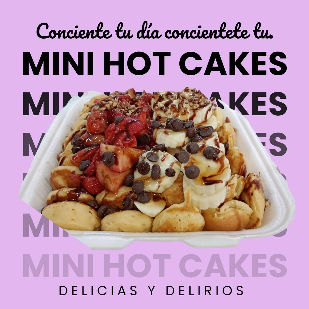10 Mini Hot Cakes acompañados de 1 jarabe 1 Fruta 1 Toping a elegir