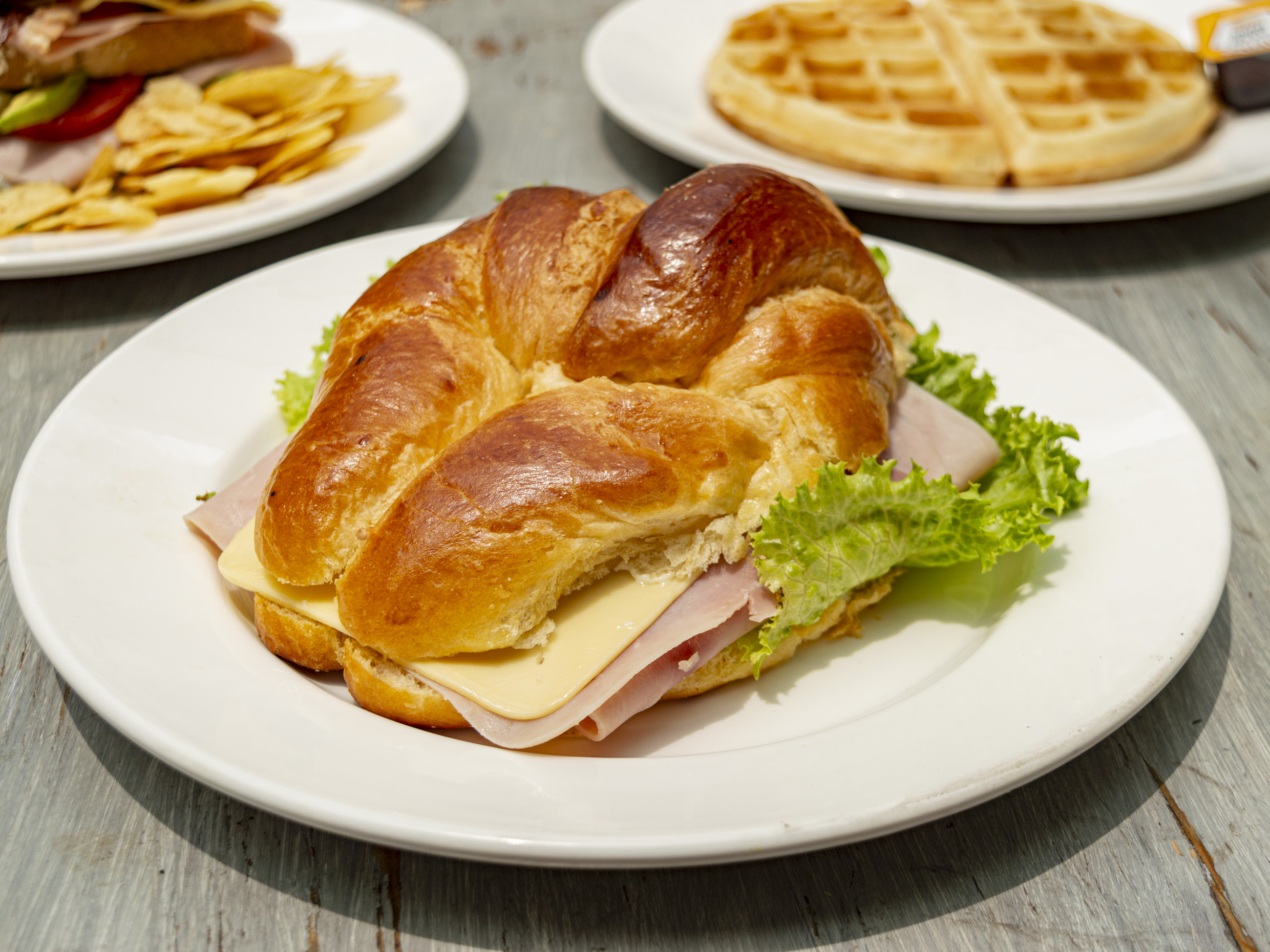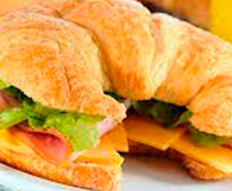 Cuernito de Jamon y Queso Manchego con lechuga, jitomate, cebolla, aguacate y rajas. Acompañado con papas de hojuela. A elegir fruta de temporada o gelatina del dia. Cafe de olla, americano o te.