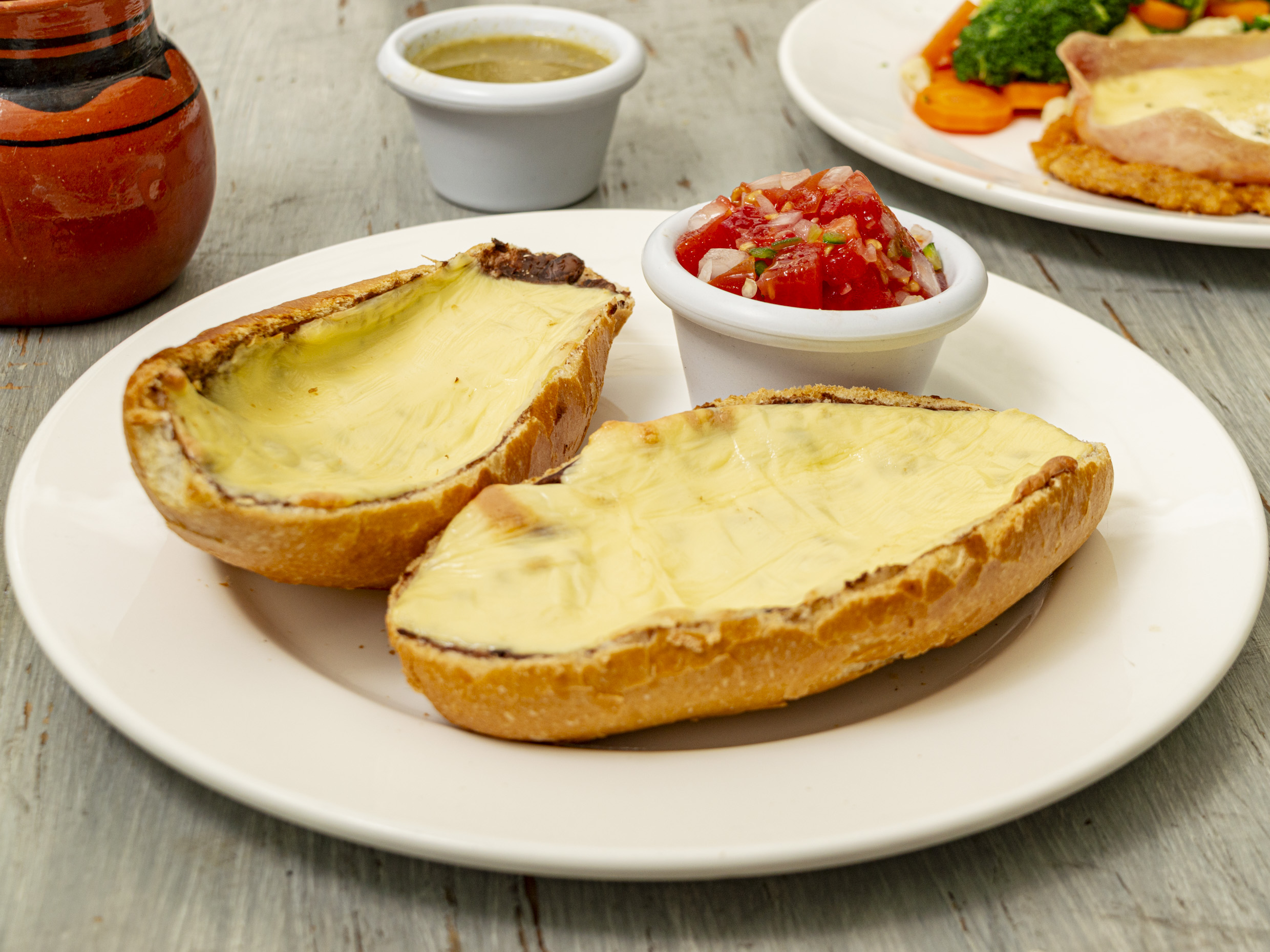 Pan Gratinado con Queso Manchego (2 piezas) acompañado con pico de gallo, acompañados con fruta de temporada o gelatina del dia. Cafe de olla, americano o te
