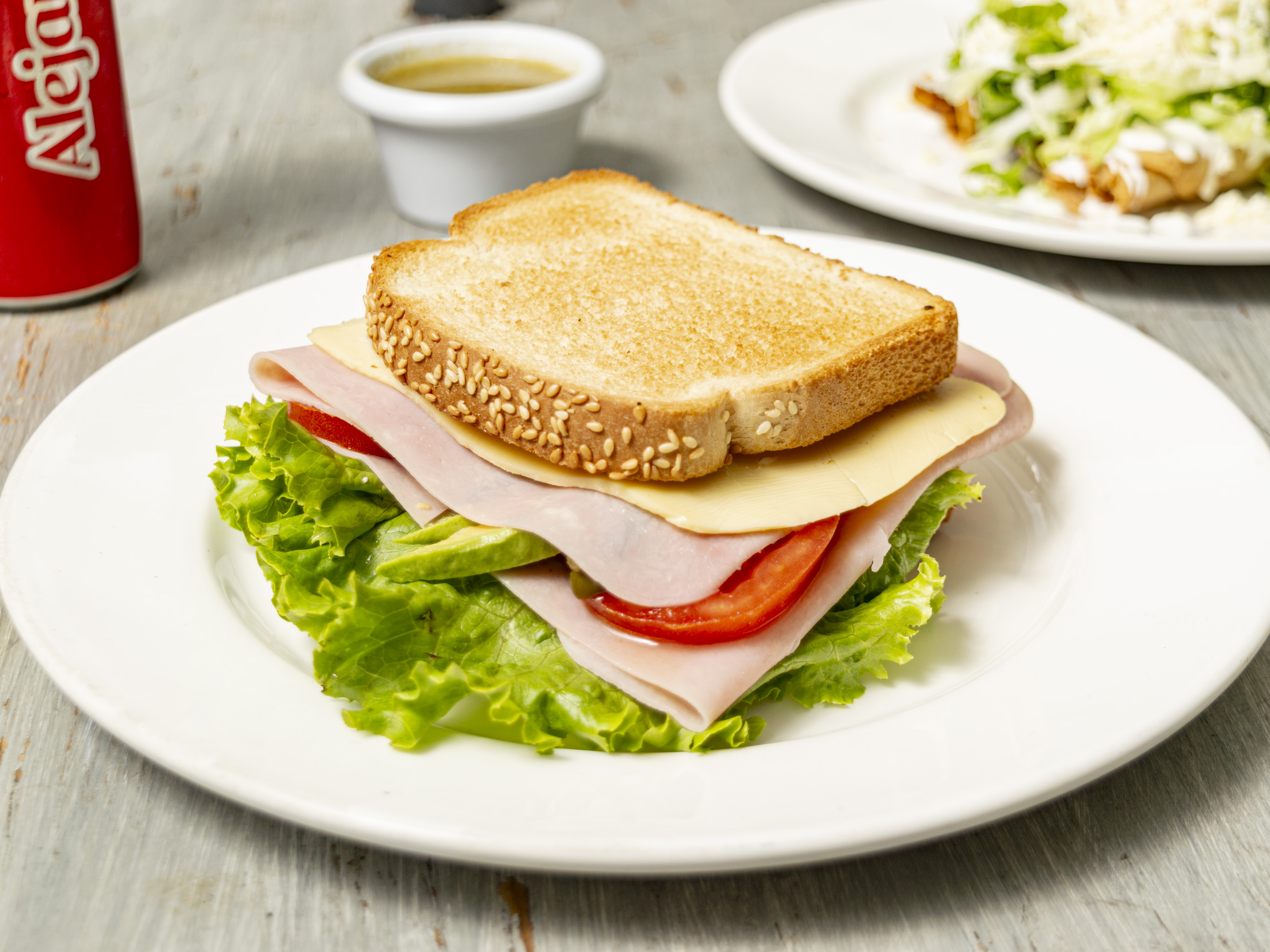 Sandwich de Jamon y Queso Manchego con lechuga, jitomate, cebolla, aguacate y rajas.
