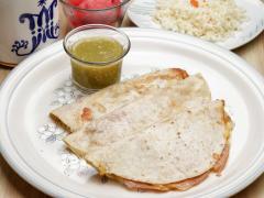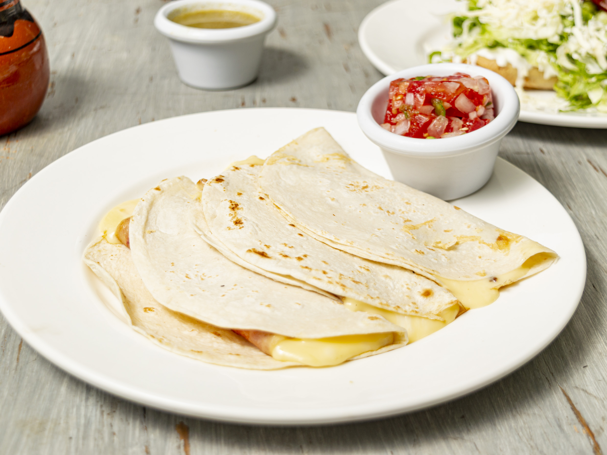 Sincronizadas de tortilla de harina(3 piezas) con jamón, queso manchego, queso oaxaca, acompañadas con pico de gallo (Jitomáte, Cebolla, Chile Verde)