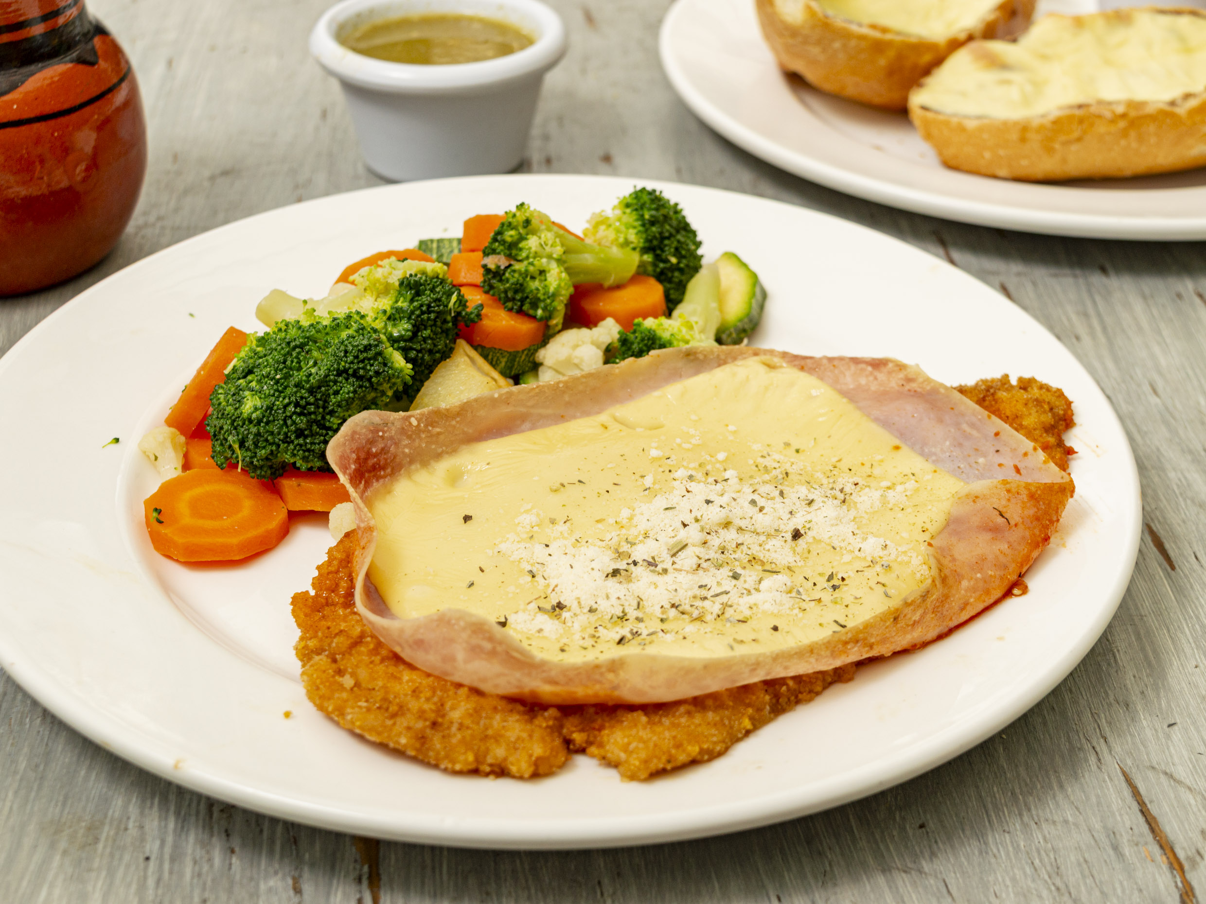 Pechuga Empanizada Bañada en salsa de tomate, Jamon y Queso Manchego con un toque de finas llervas