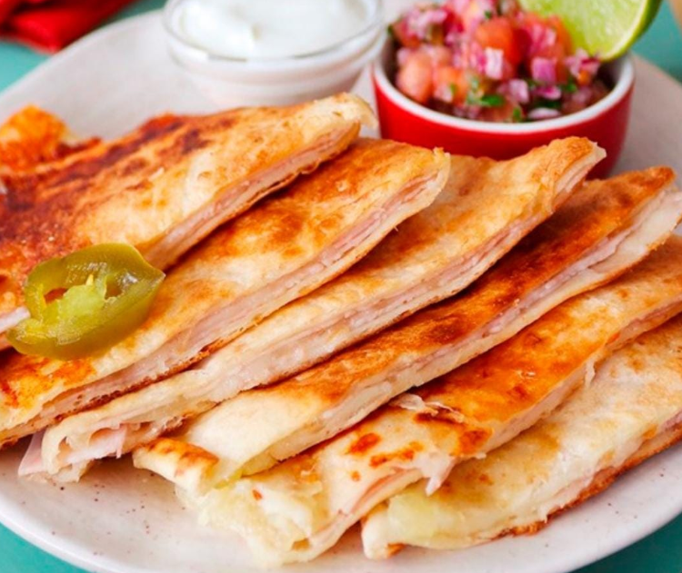 Sincronizadas de tortilla de harina (3 piezas) con jamón, queso manchego, queso oaxaca, acompañadas con pico de gallo (jitomate, cebolla, chile verde).